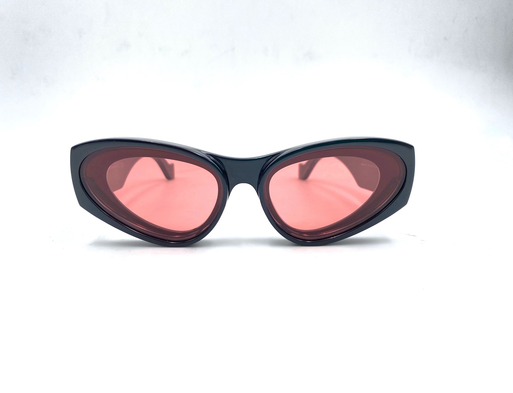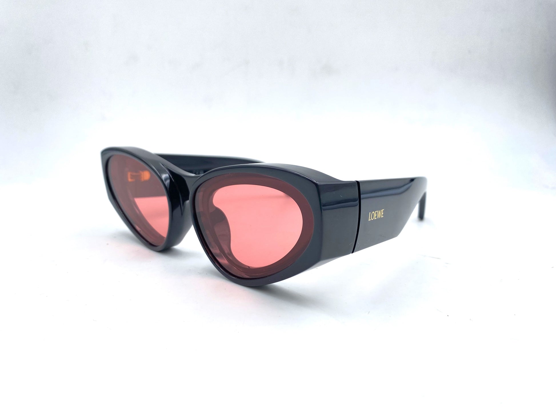 Occhiale da sole Loewe in acetato nero lucido. Frontale stretto cat-eye con lenti rosa. Montatura ultra spessa e aste con nome del brand e logo ai terminali color oro.