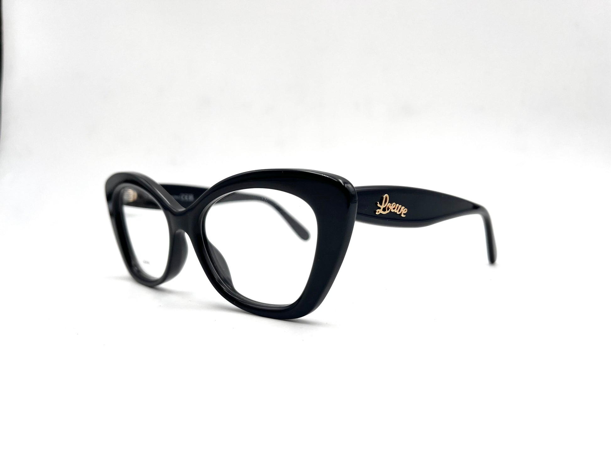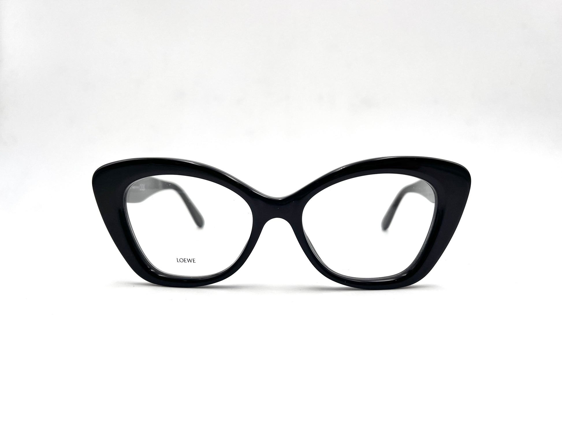 Montatura da vista Loewe in acetato nero lucido. Frontale cat-eye e aste con nome del brand oro.