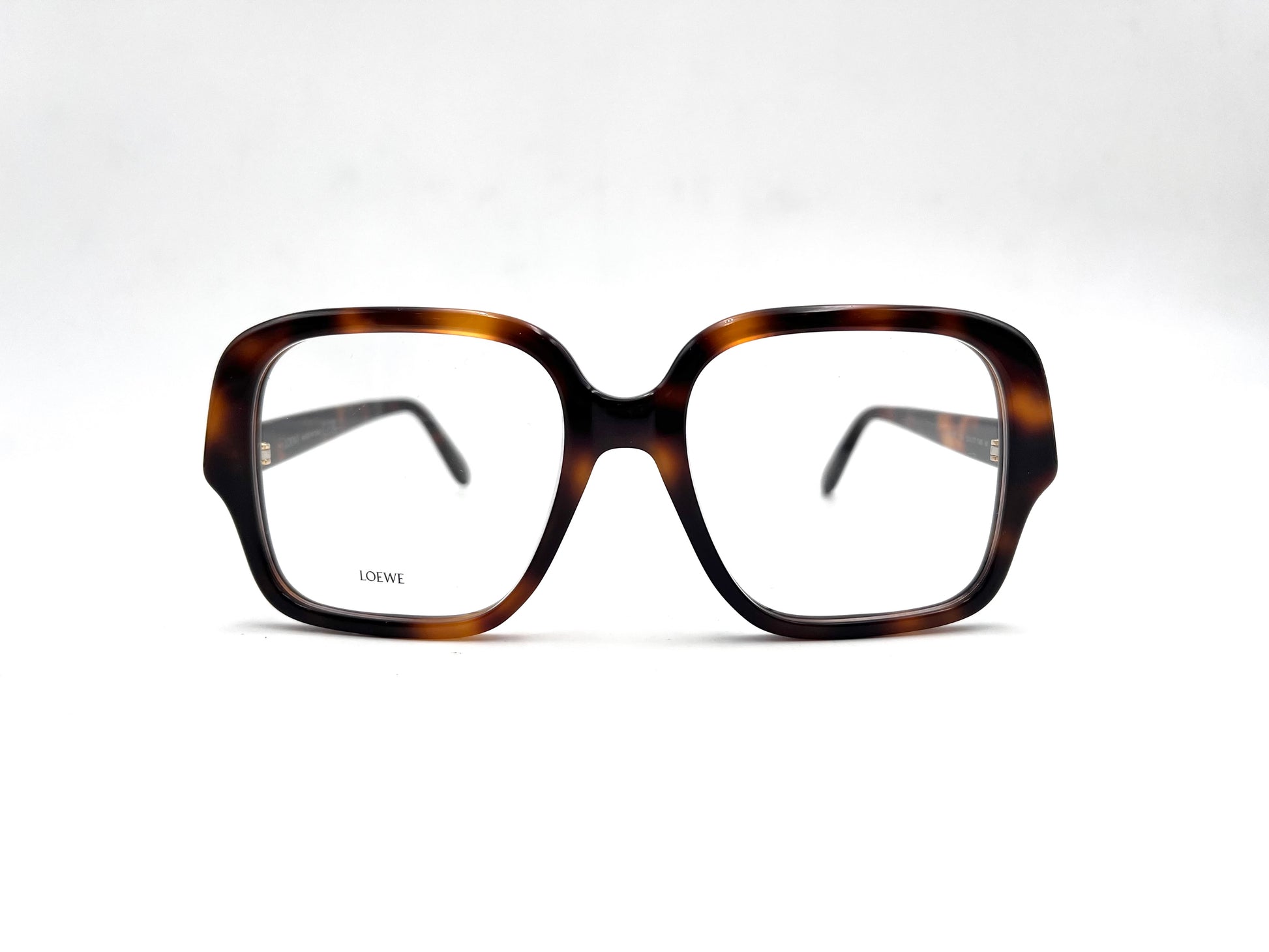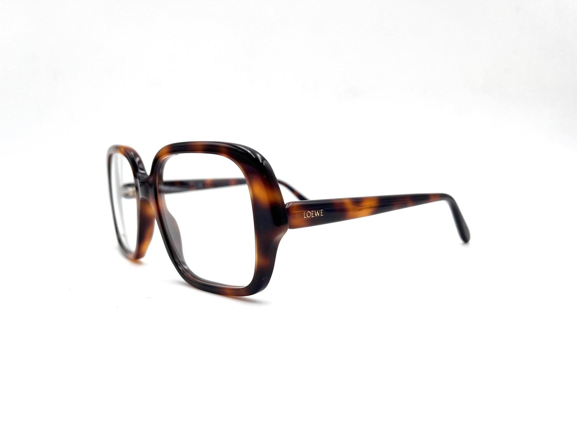 Montatura da vista Loewe in acetato tartarugato lucido. Frontale ampio squadrato e aste con nome del brand oro.