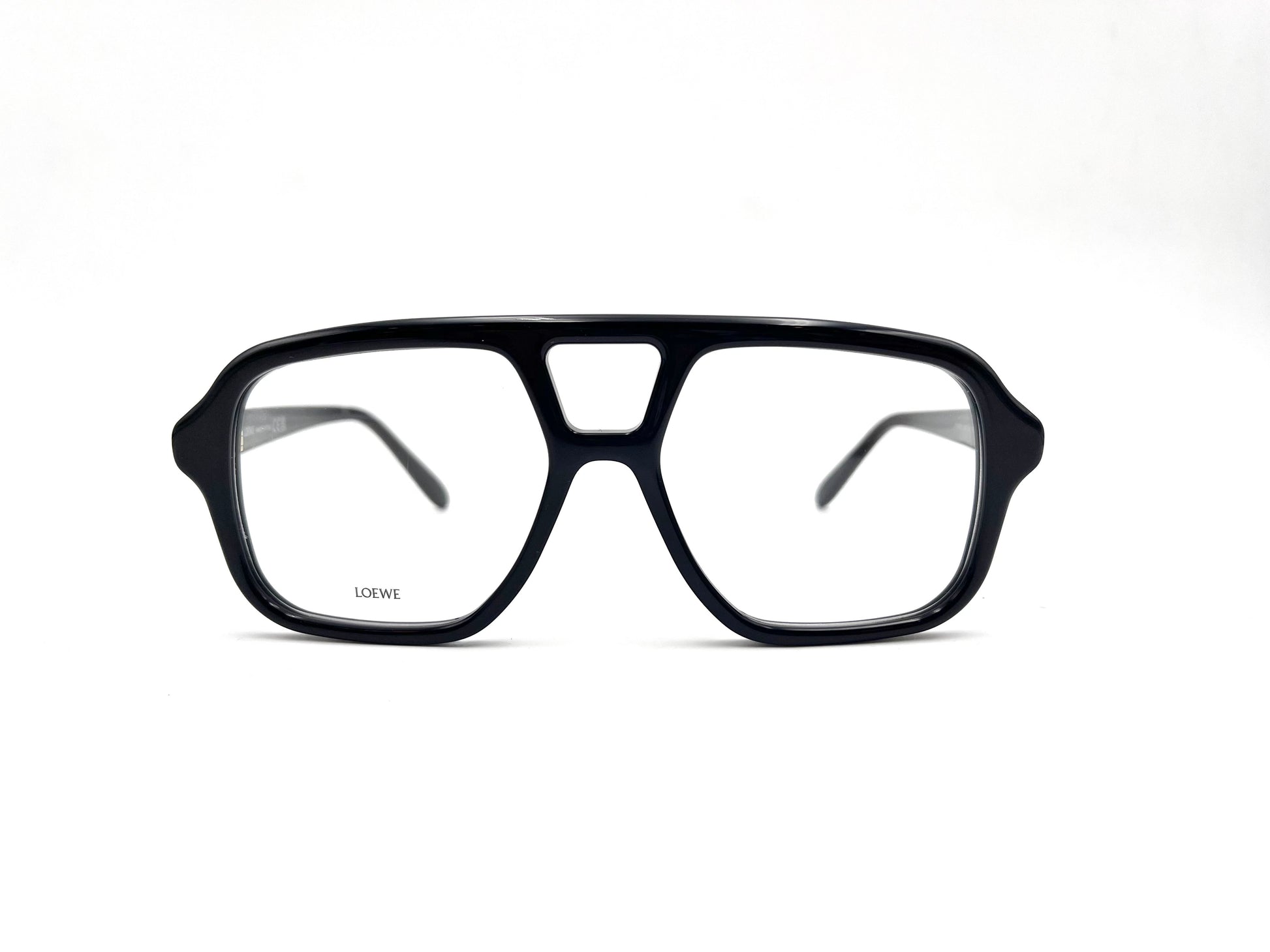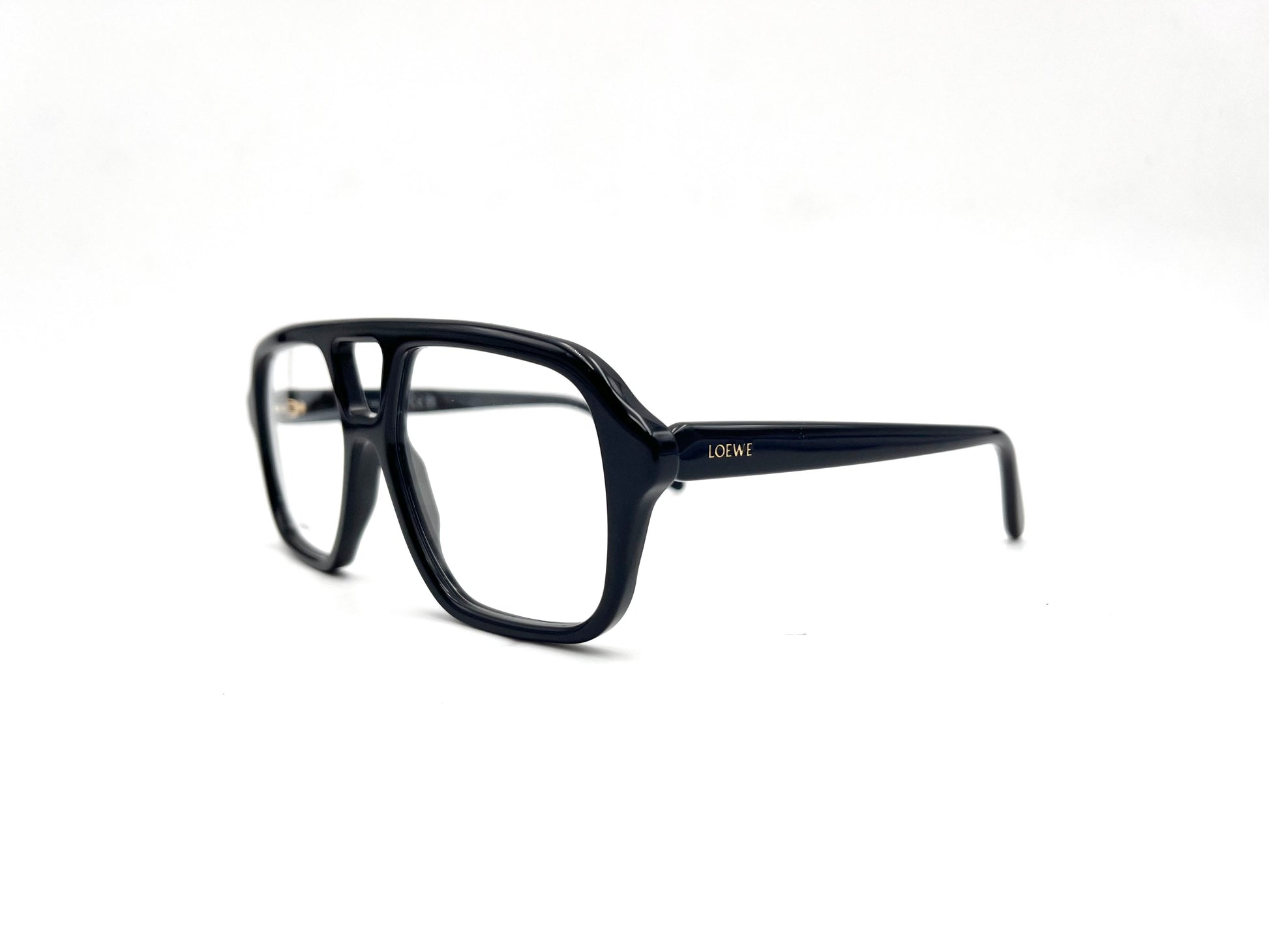 Montatura da vista Loewe in acetato nero lucido. Frontale squadrato stile aviator con doppio ponte e aste con nome del brand.