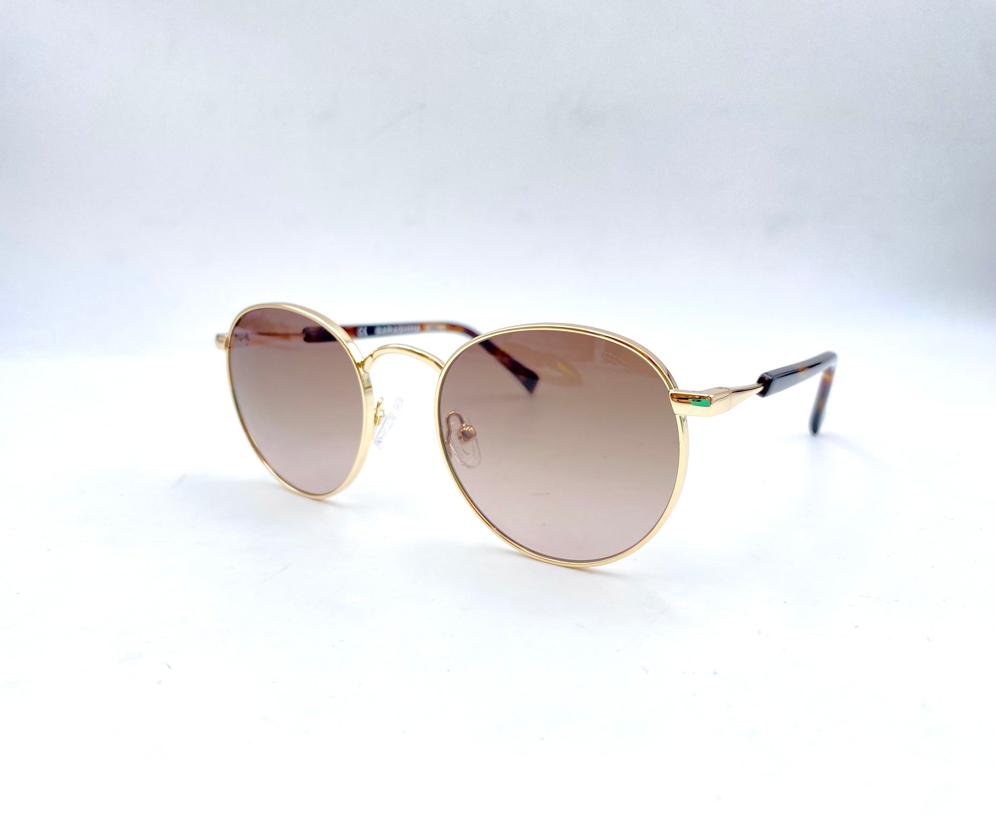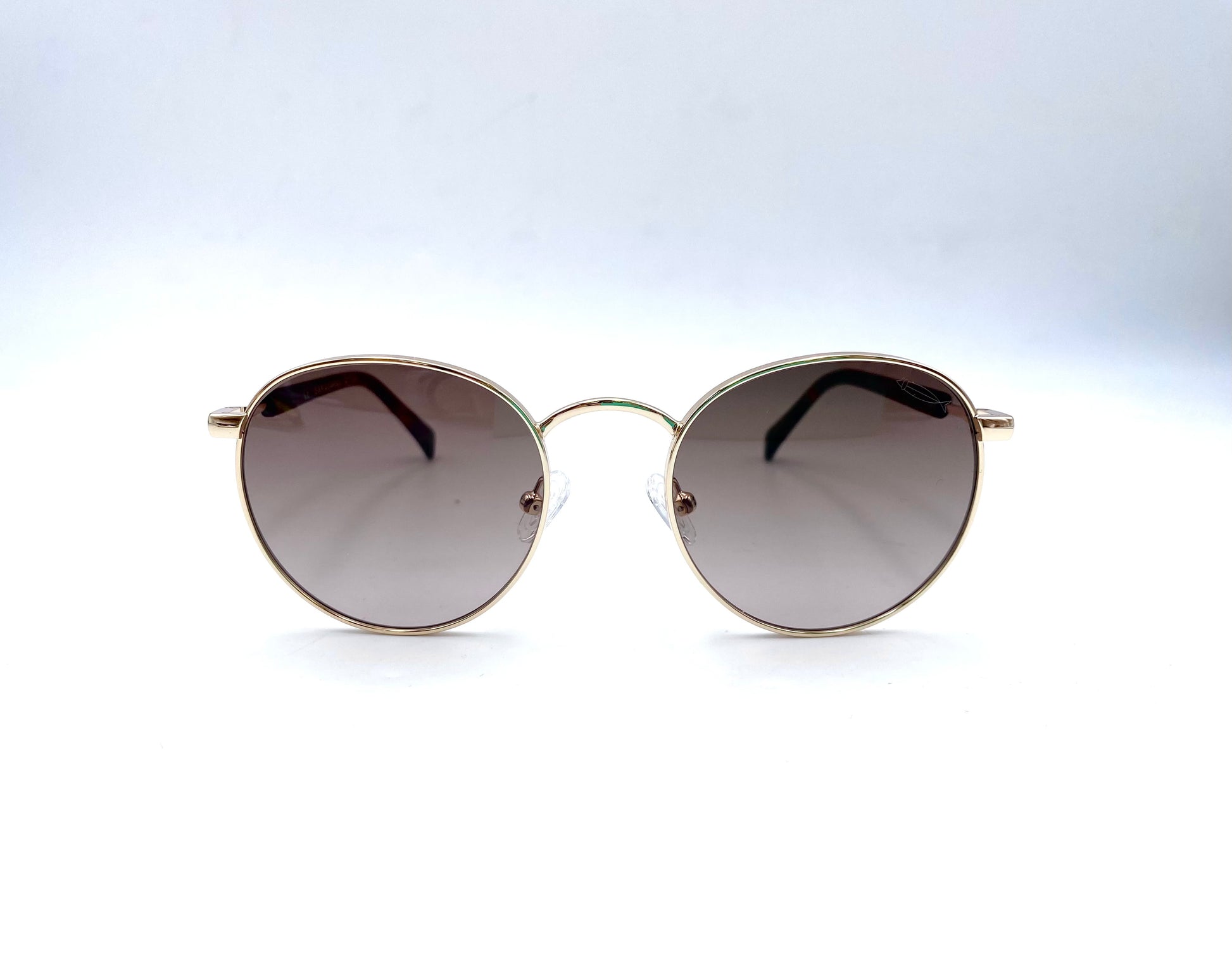 Occhiale da sole in metallo oro dalla forma tondeggiante con lente marrone sfumata. Aste in celluloide tartarugata. Ponte classico e naselli in metallo regolabili.