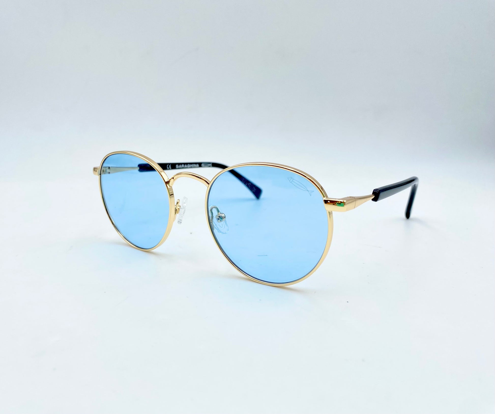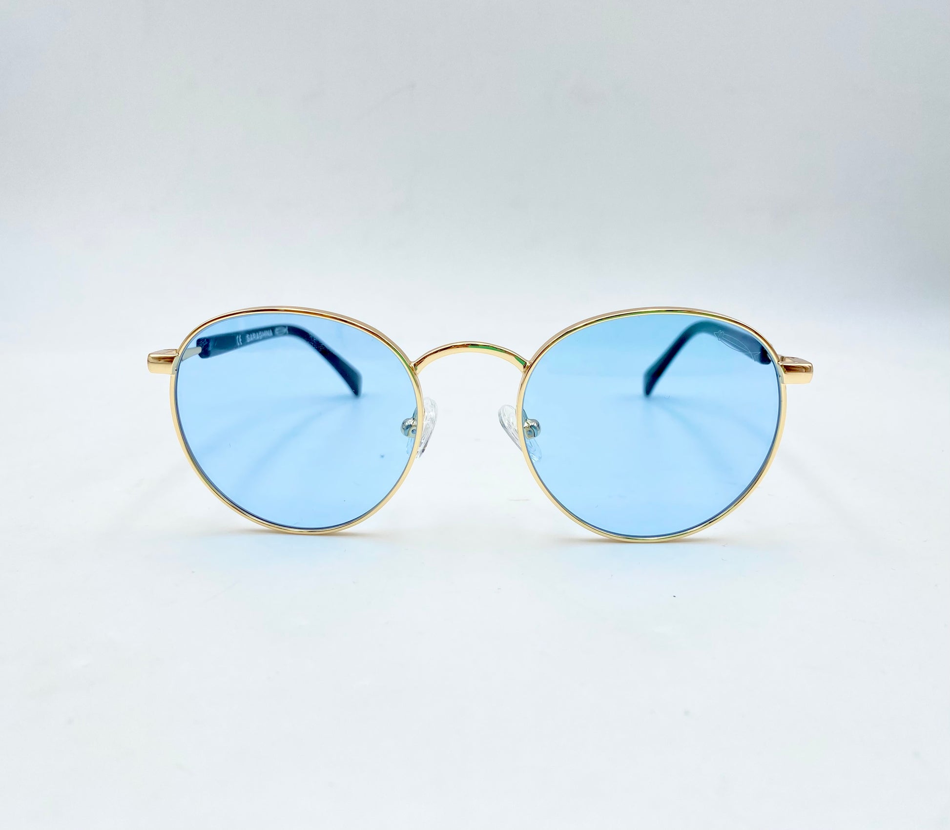Occhiale da sole in metallo oro dalla forma tondeggiante con lente azzurra. Aste in celluloide nera. Ponte classico e naselli in metallo regolabili.