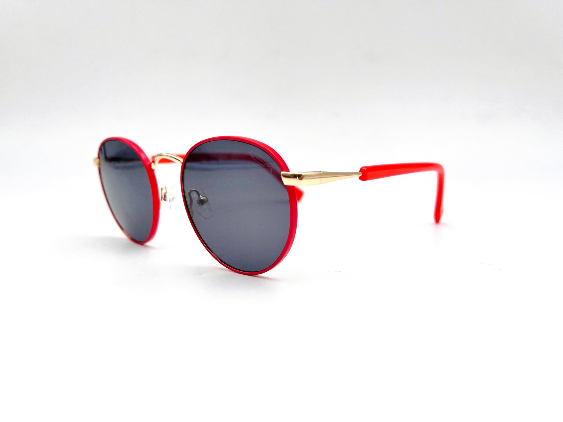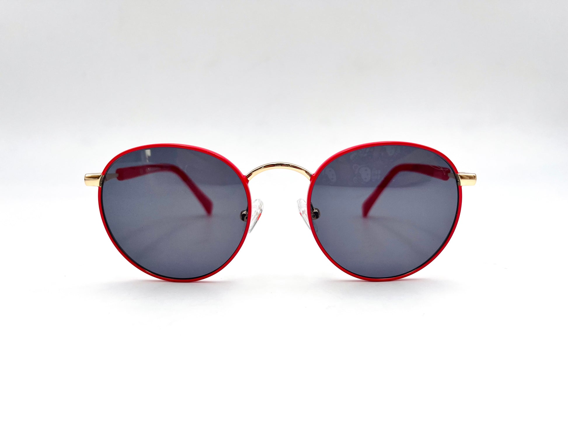 Occhiale da sole Saraghina in metallo rosso e oro. Frontale tondo con lenti grigio fumo e aste rivestite in acetato rosso semitrasparente. Comodi naselli in silicone.