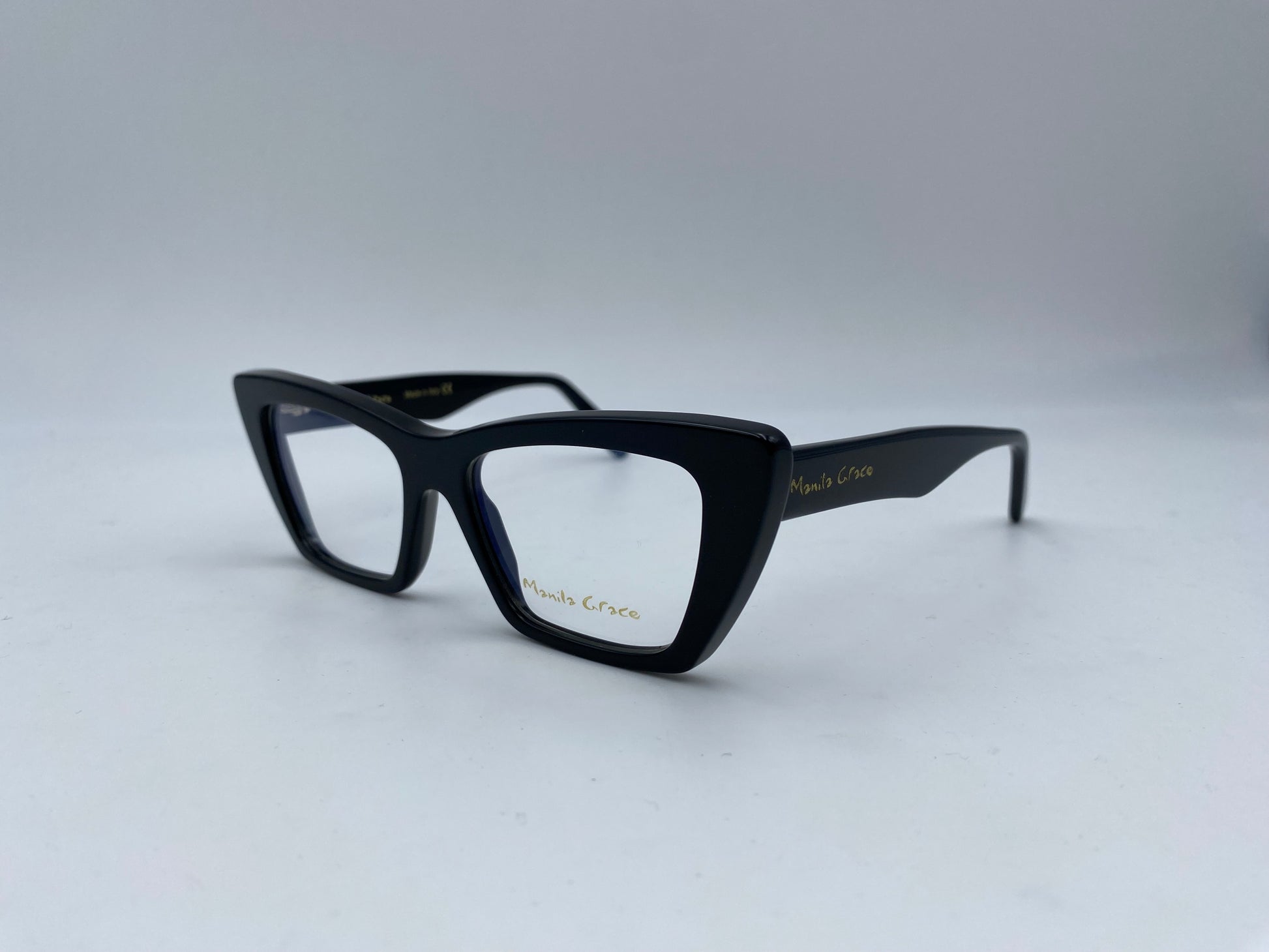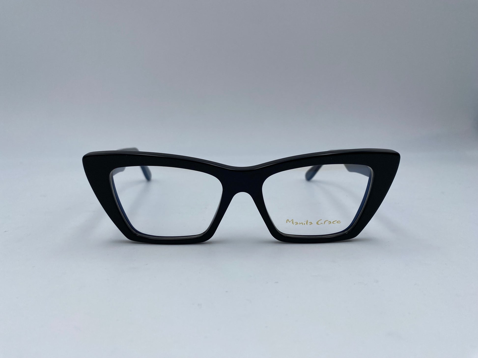 Occhiale da vista in acetato nero. Frontale cat-eye con aste confortevoli e firma del brand oro. Ponte classico e naselli in acetato.