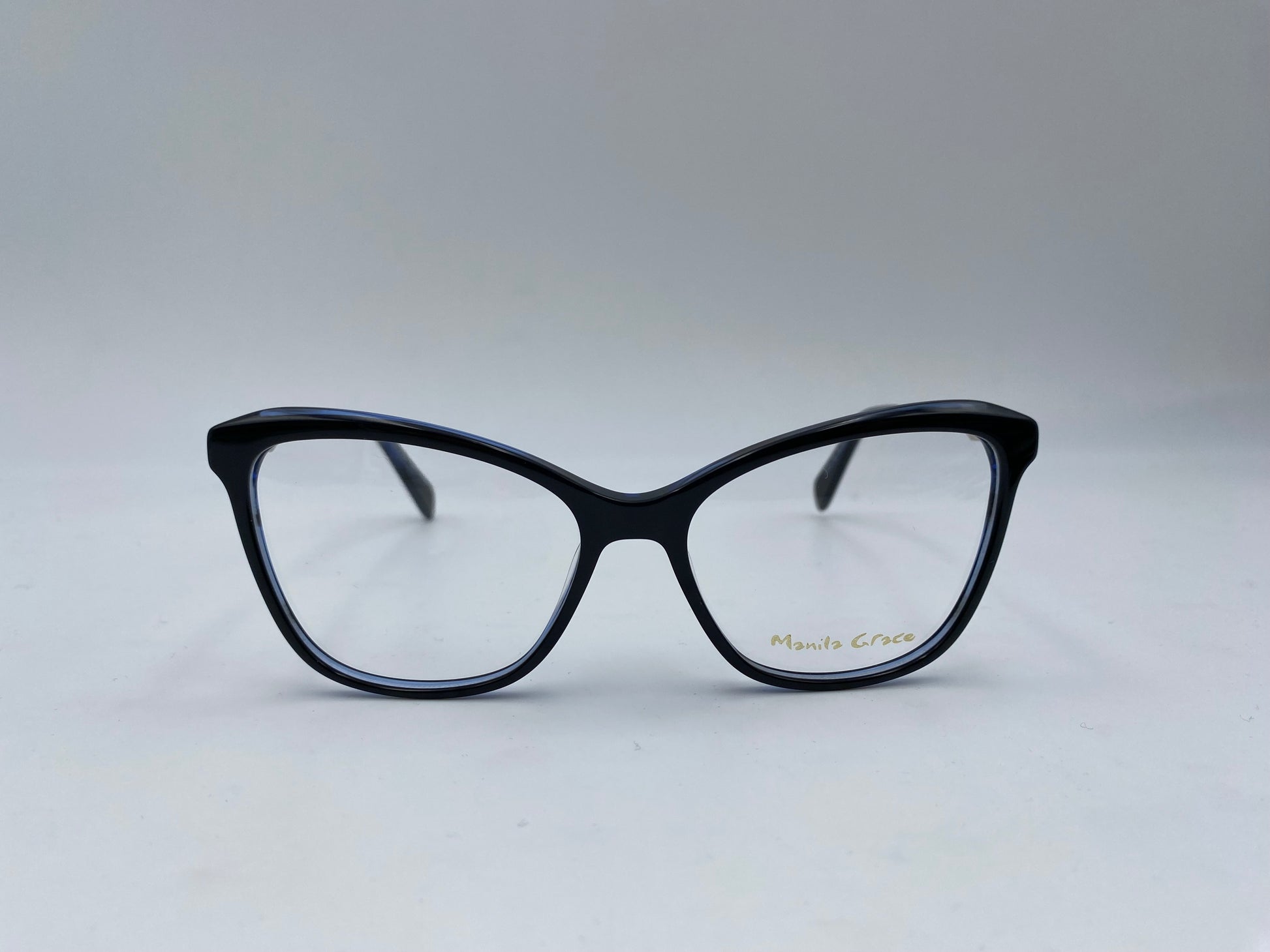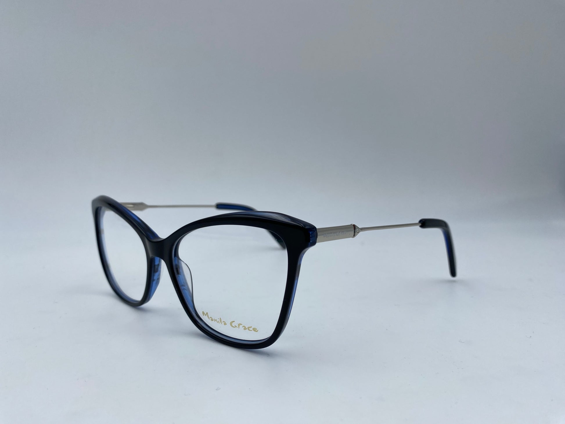 Occhiale da vista in acetato nero con sfumature interne blu. Frontale butterfly nero, con aste sottili in metallo argento. Terminali in acetato nero. Ponte classico e naselli in acetato.