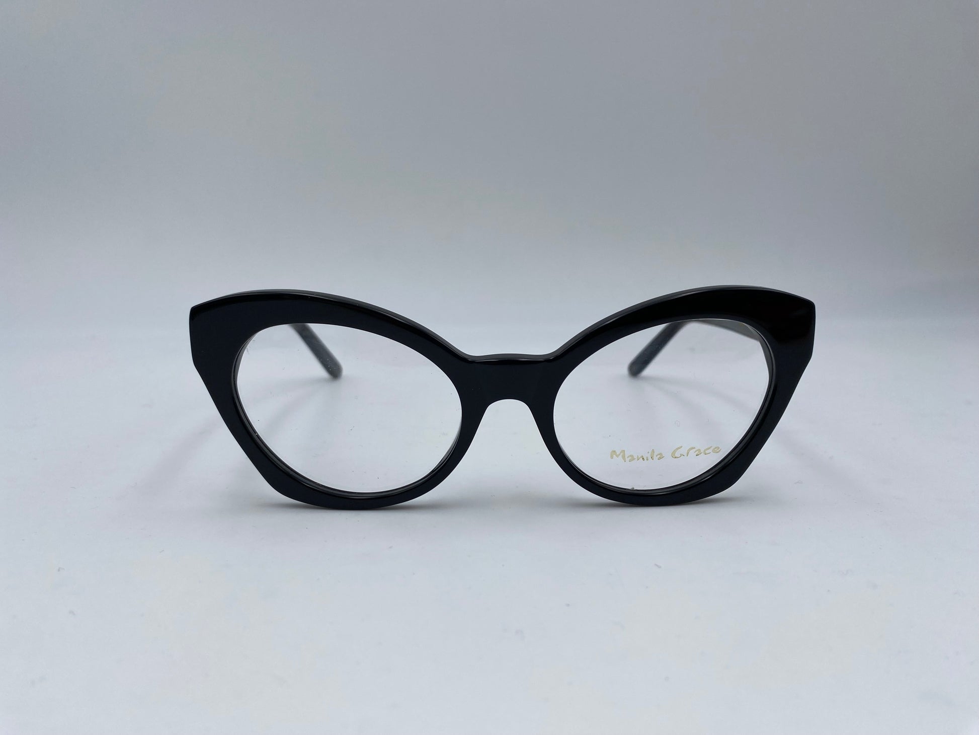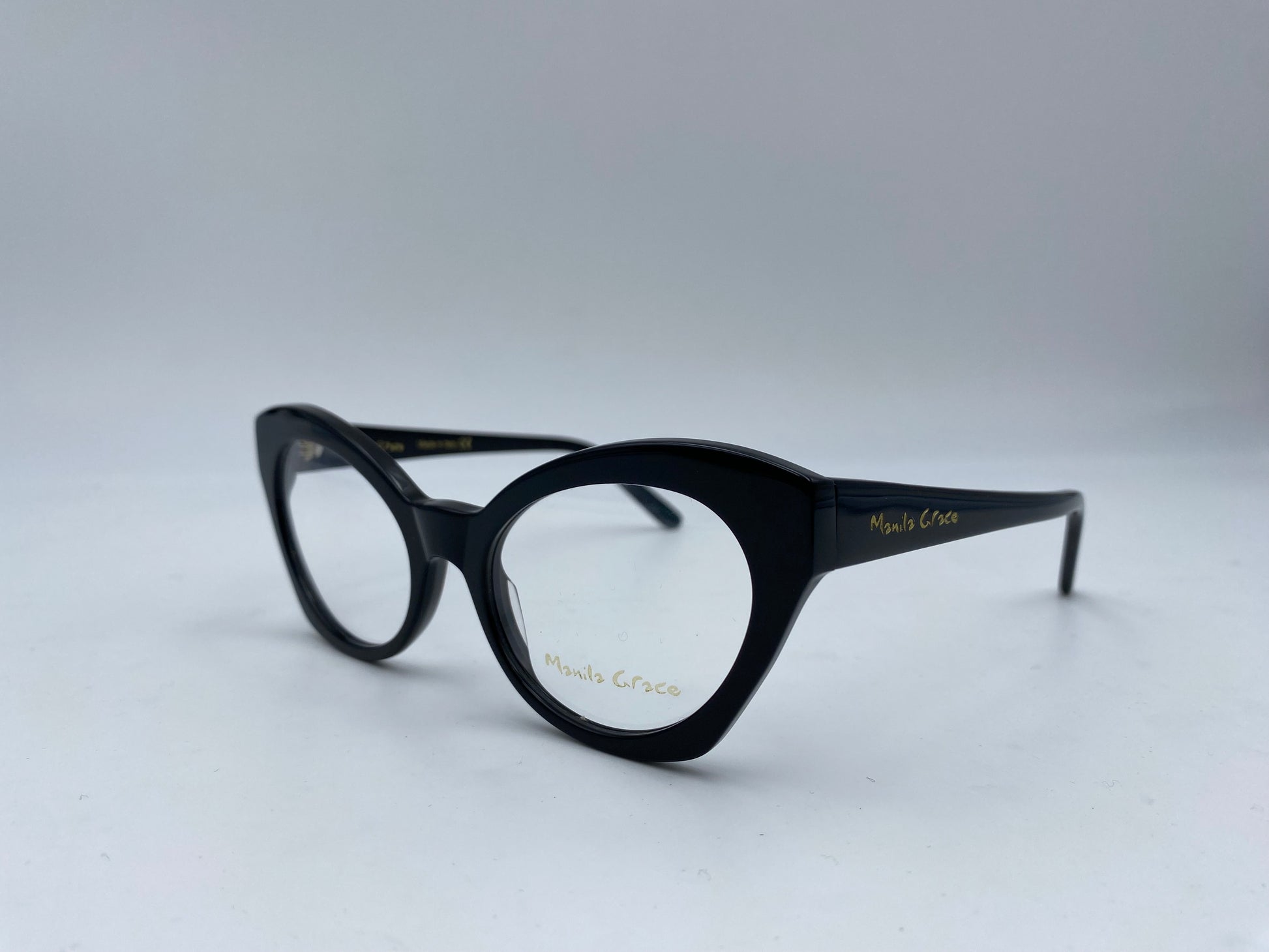 Occhiale da vista in acetato nero. Frontale cat-eye con aste sottili, confortevoli e firma del brand oro. Ponte classico e naselli in acetato.