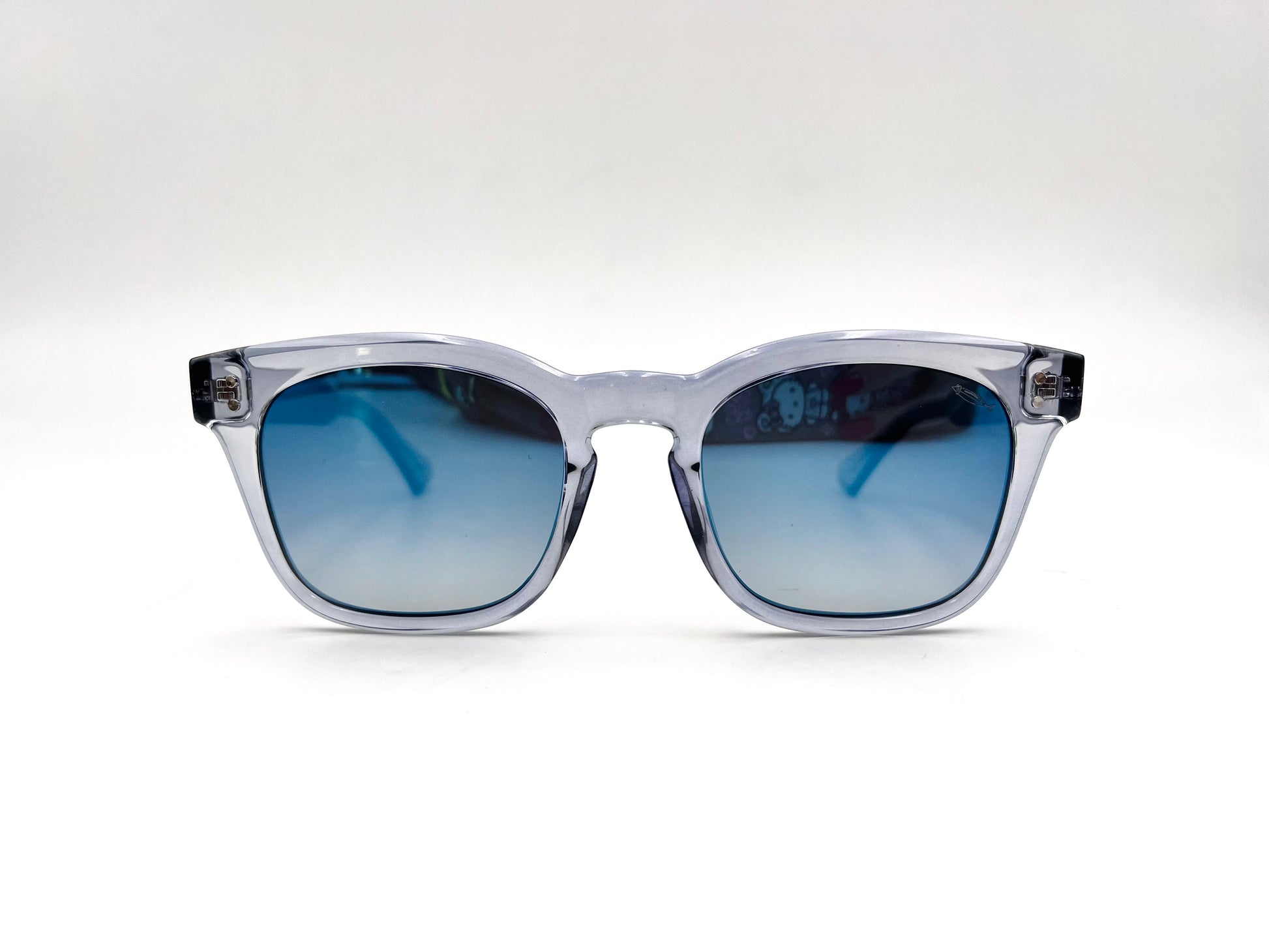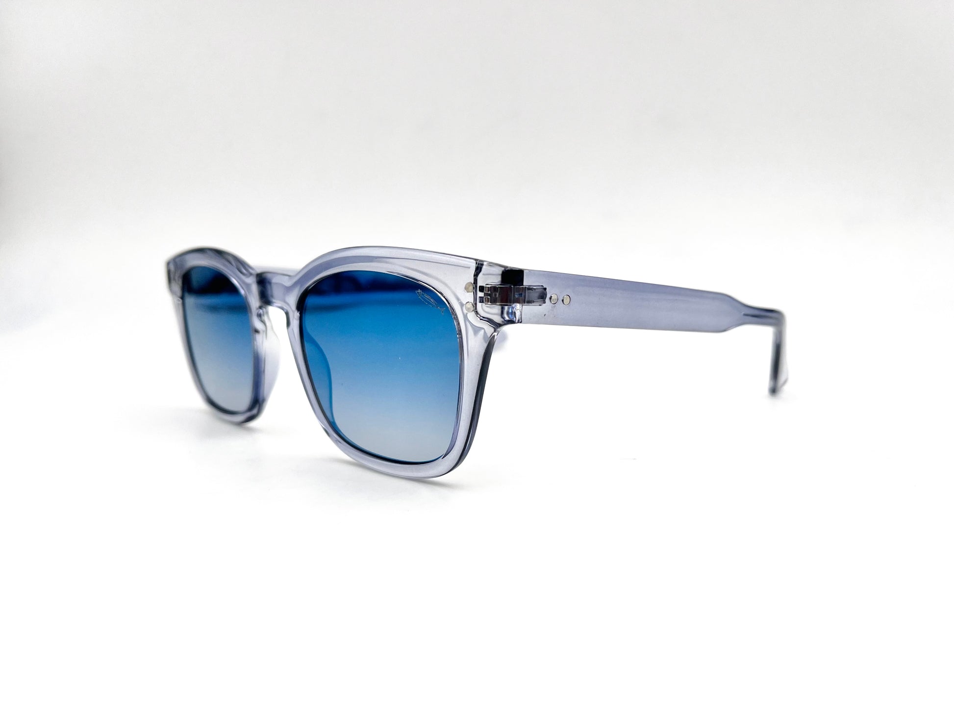 Occhiali da sole Saraghina in acetato grigio/azzurro semitrasparente. Lenti squadrate azzurre sfumate e specchiate e ponte a chiave.