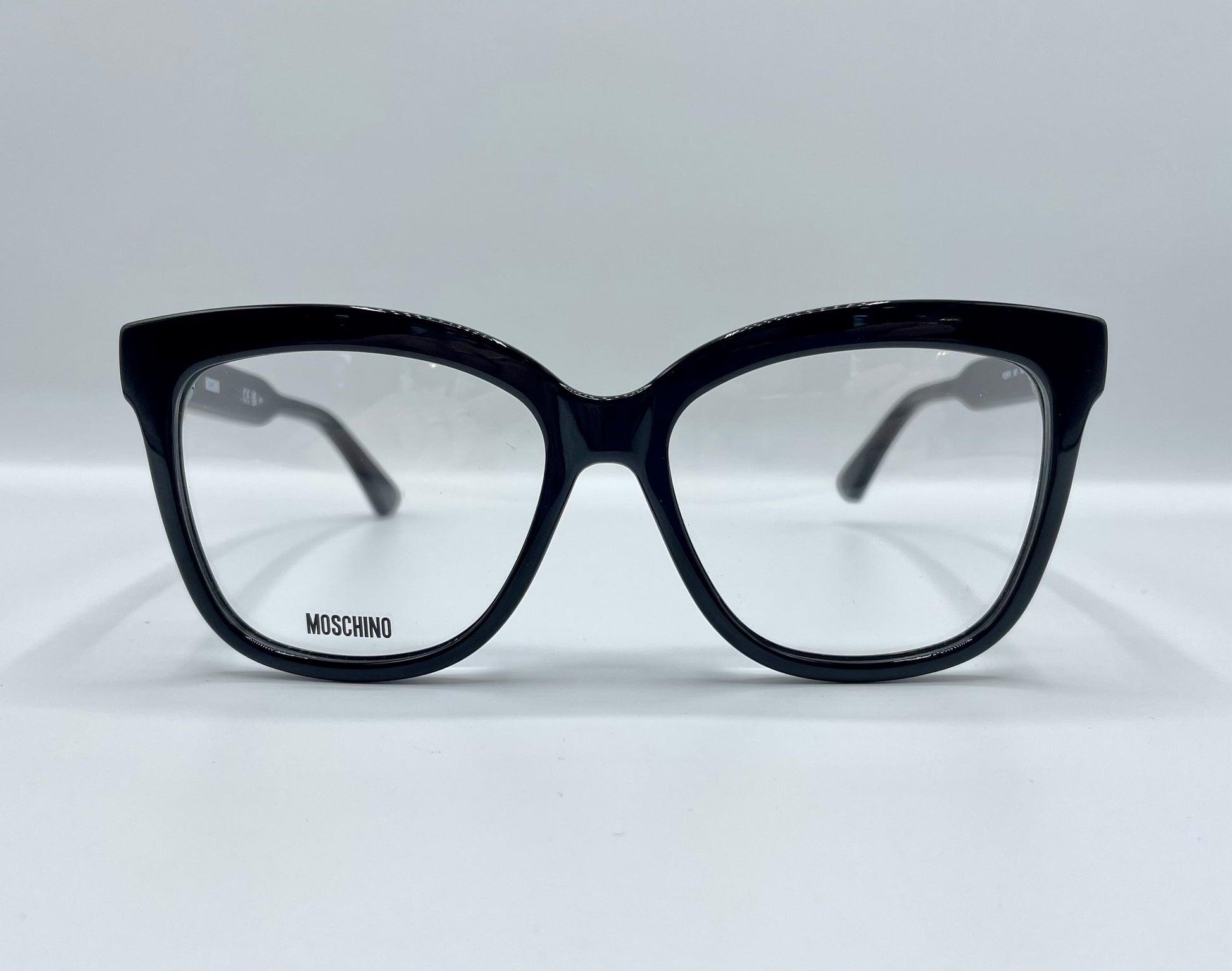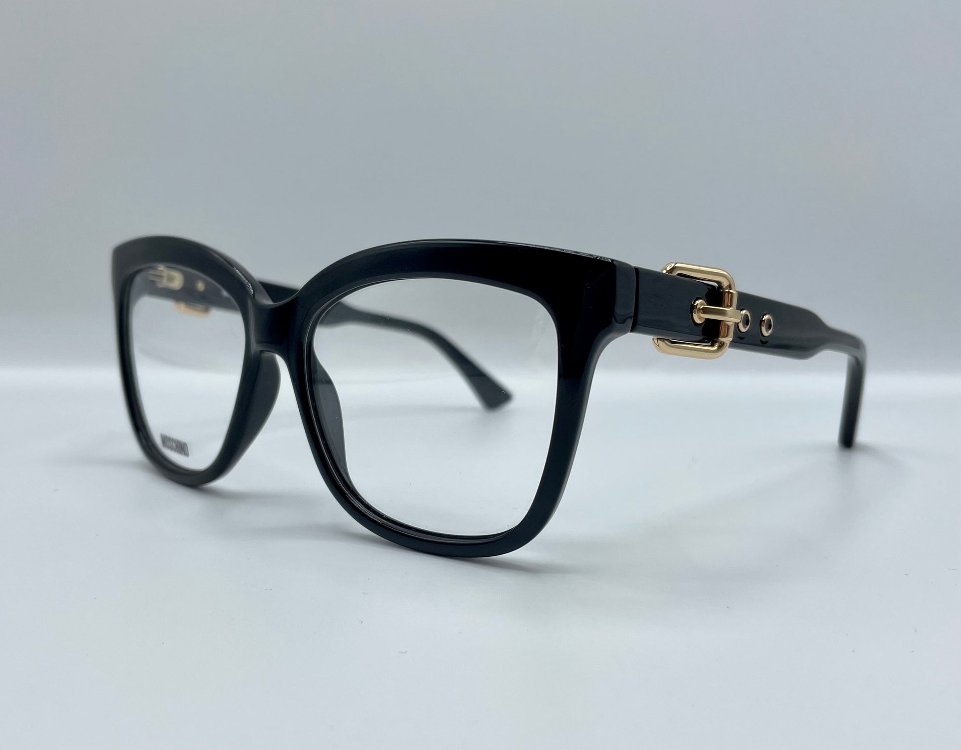 Occhiale da vista in acetato. Frontale di colore nero lucido di forma squadrata. Aste in celluloide inserto fibbia color oro e tipica firma del brand sul terminale.