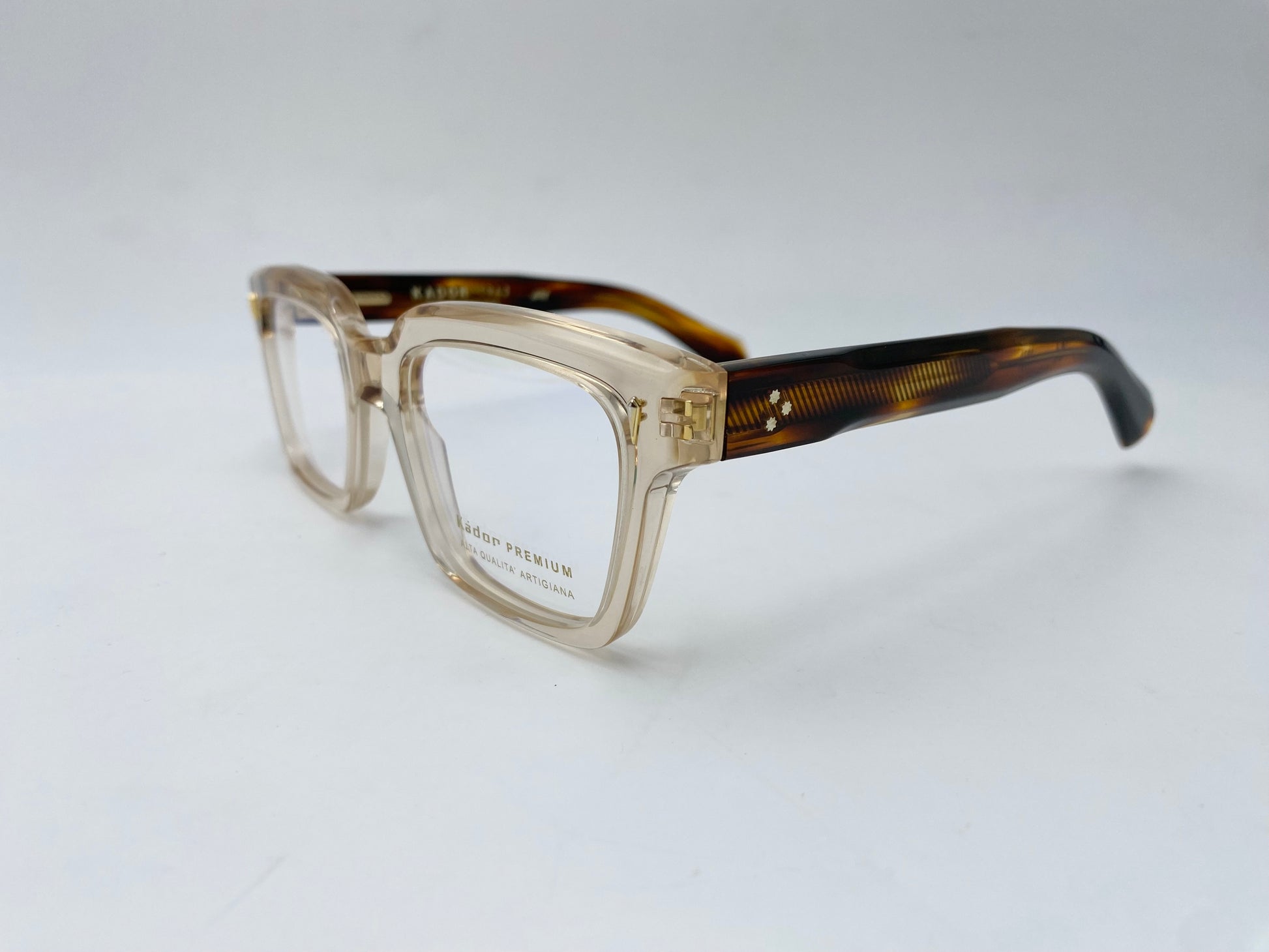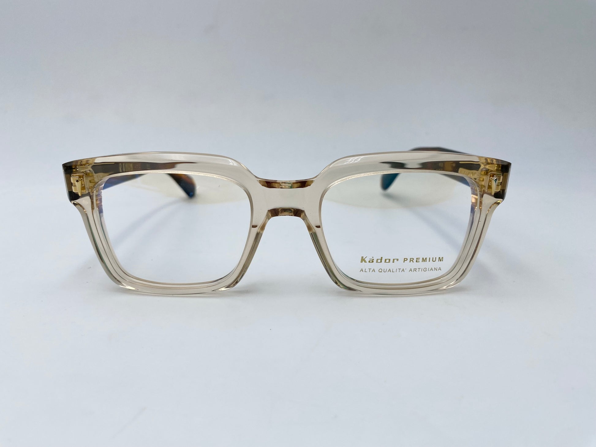 Occhiale da vista Kàdor con frontale squadrato in acetato trasparente color champagne, e aste in acetato lucido tartarugato.