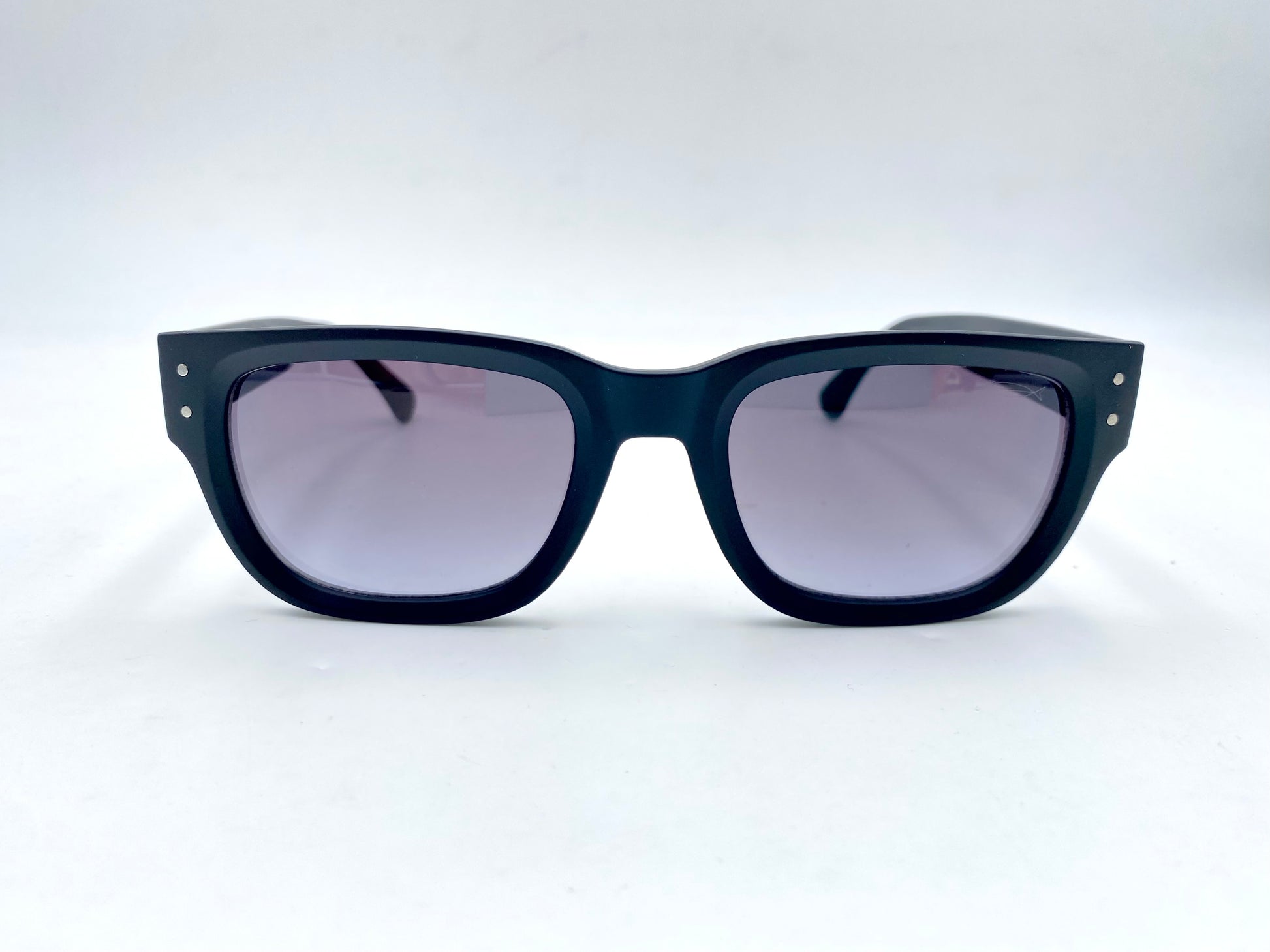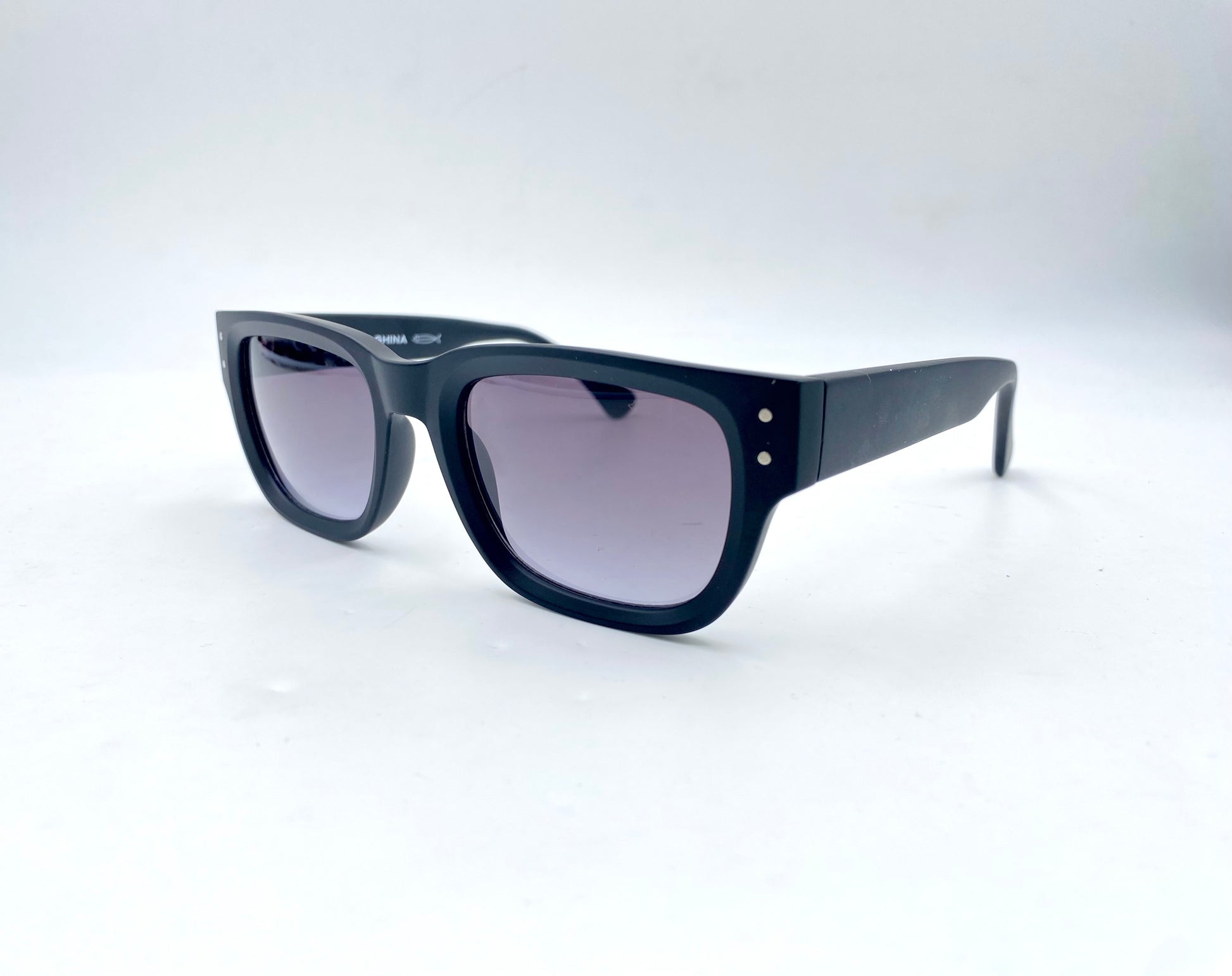 Occhiale da sole Saraghina in acetato nero opaco. Frontale squadrato con punti luce laterali e lenti grigio fumato.