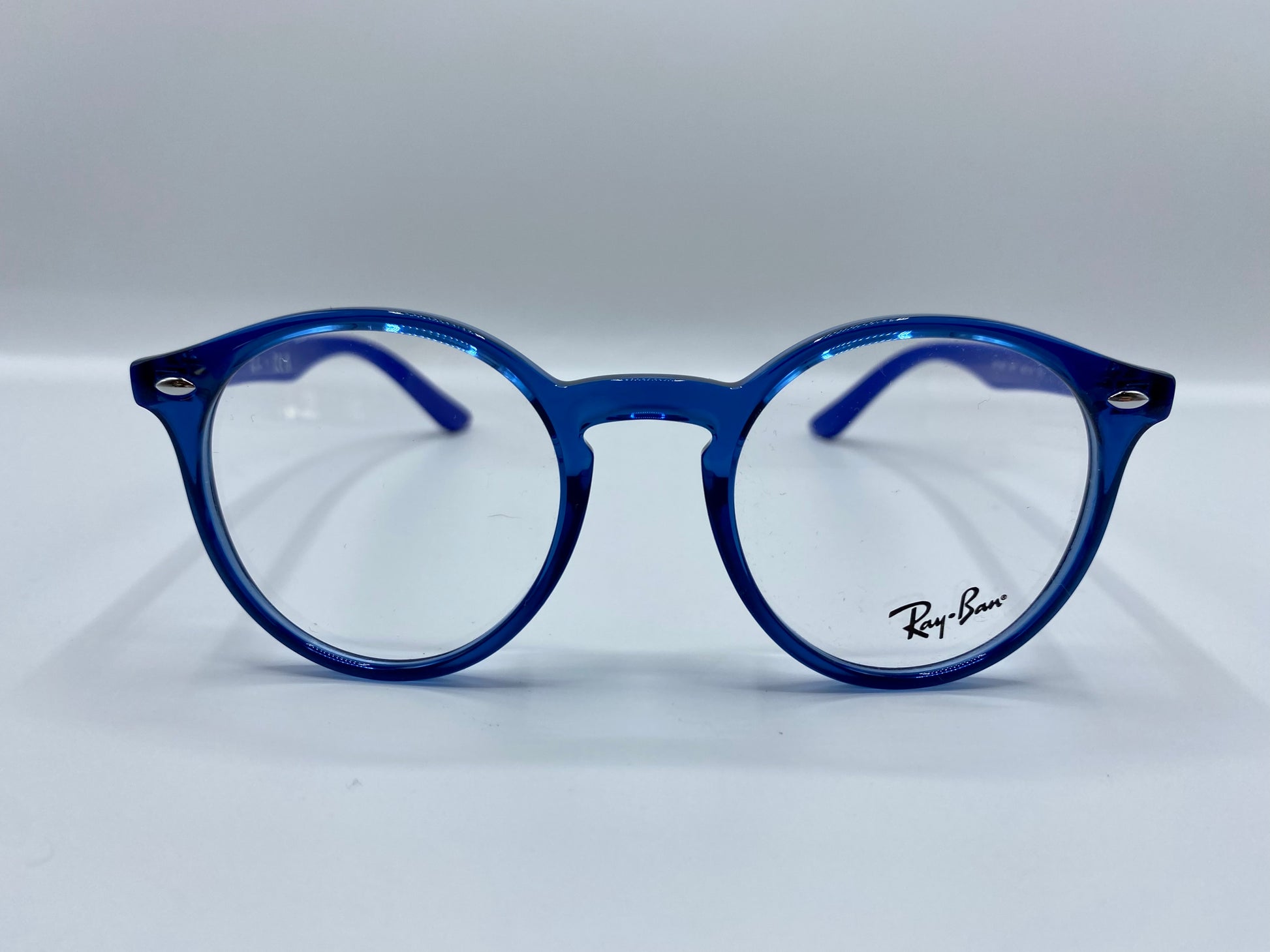 Occhiale da vista bimbo firmato Ray-Ban in acetato. Frontale rotondeggiante color blu. Aste leggere e confortevoli con tipico logo del brand. Comodi naselli acetati.