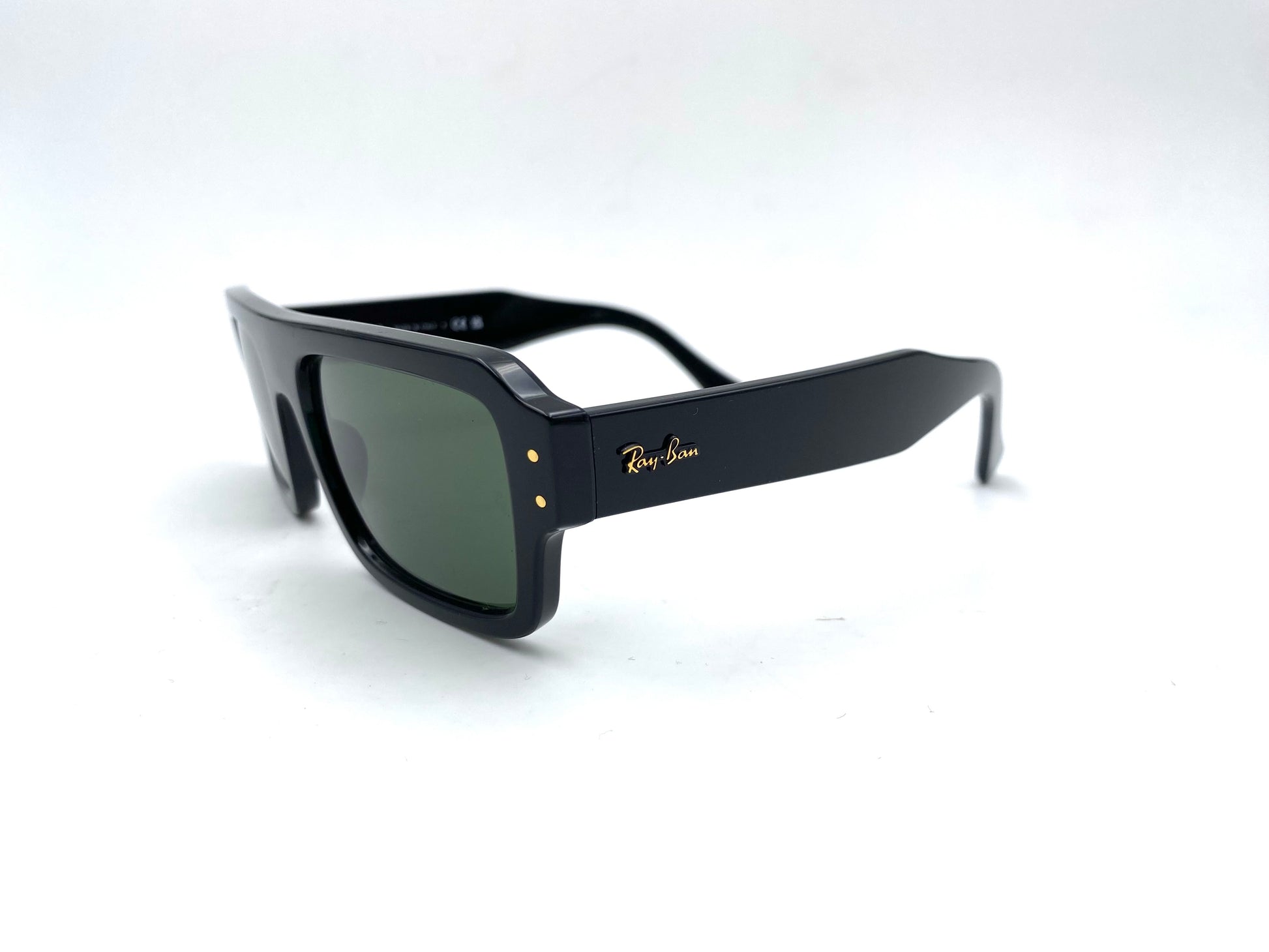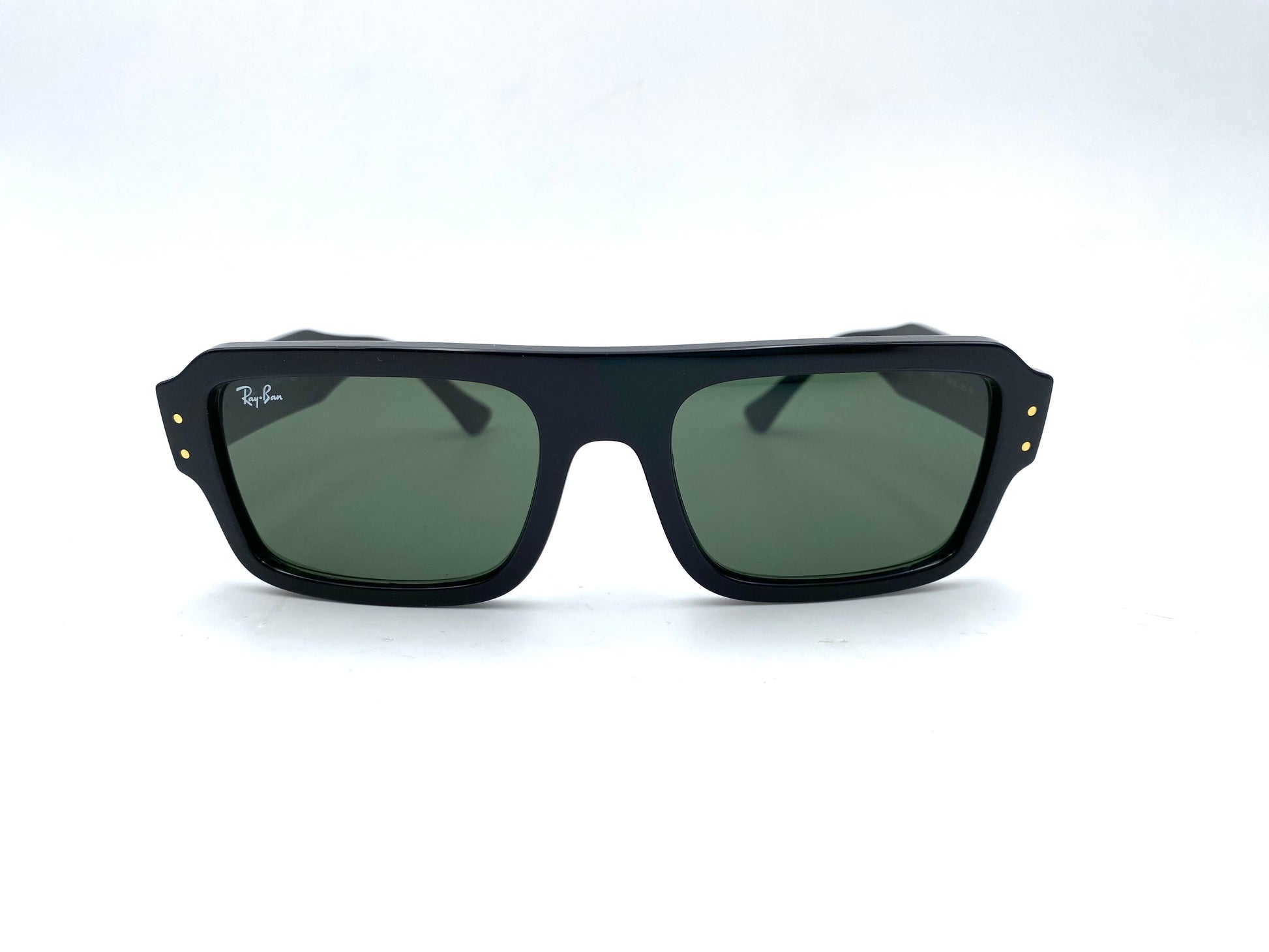 Occhiale da sole Ray-Ban in acetato nero lucido. Frontale dritto e lenti verdi squadrate. Punti luce laterali oro e aste spesse con nome del brand.