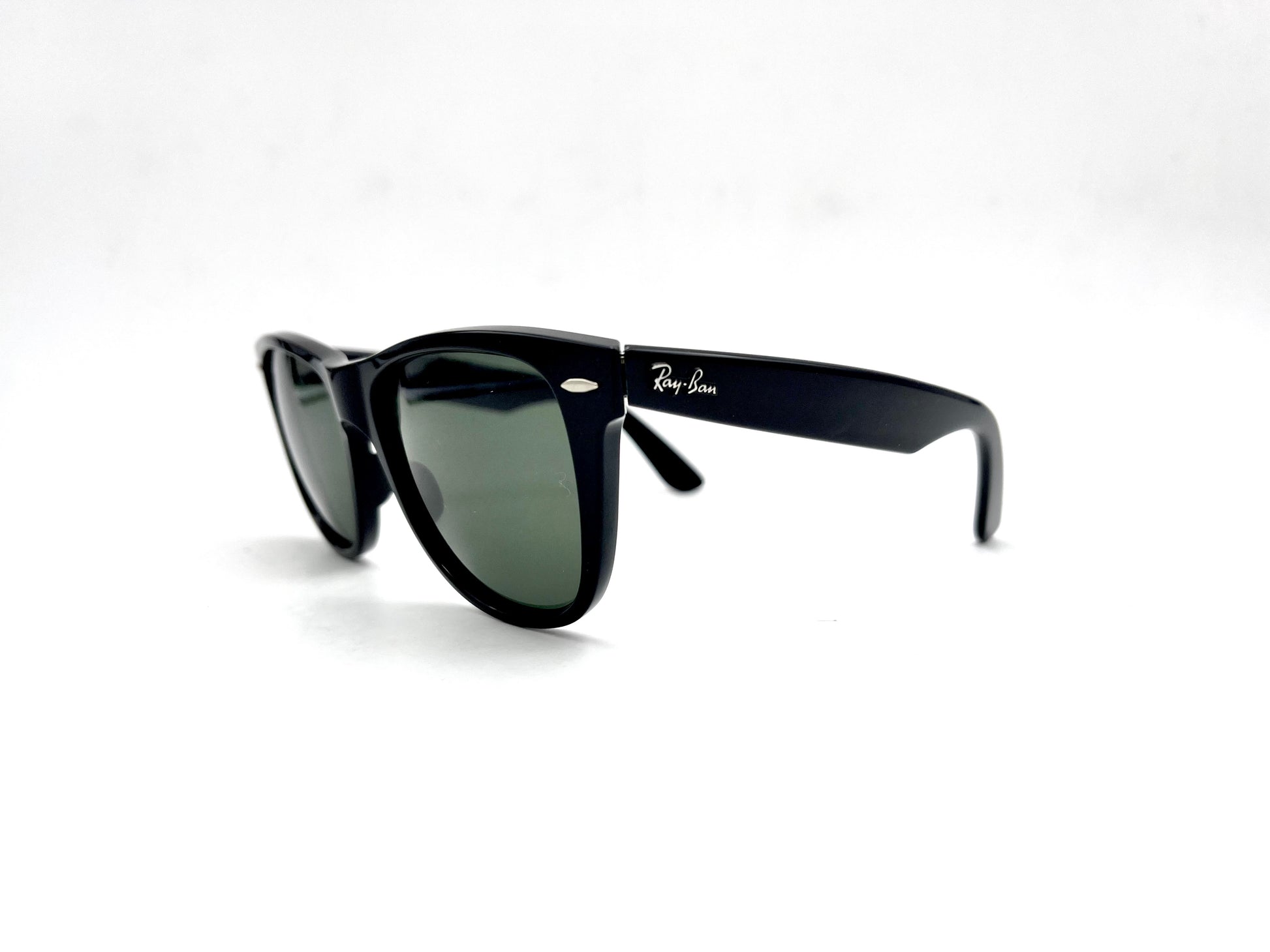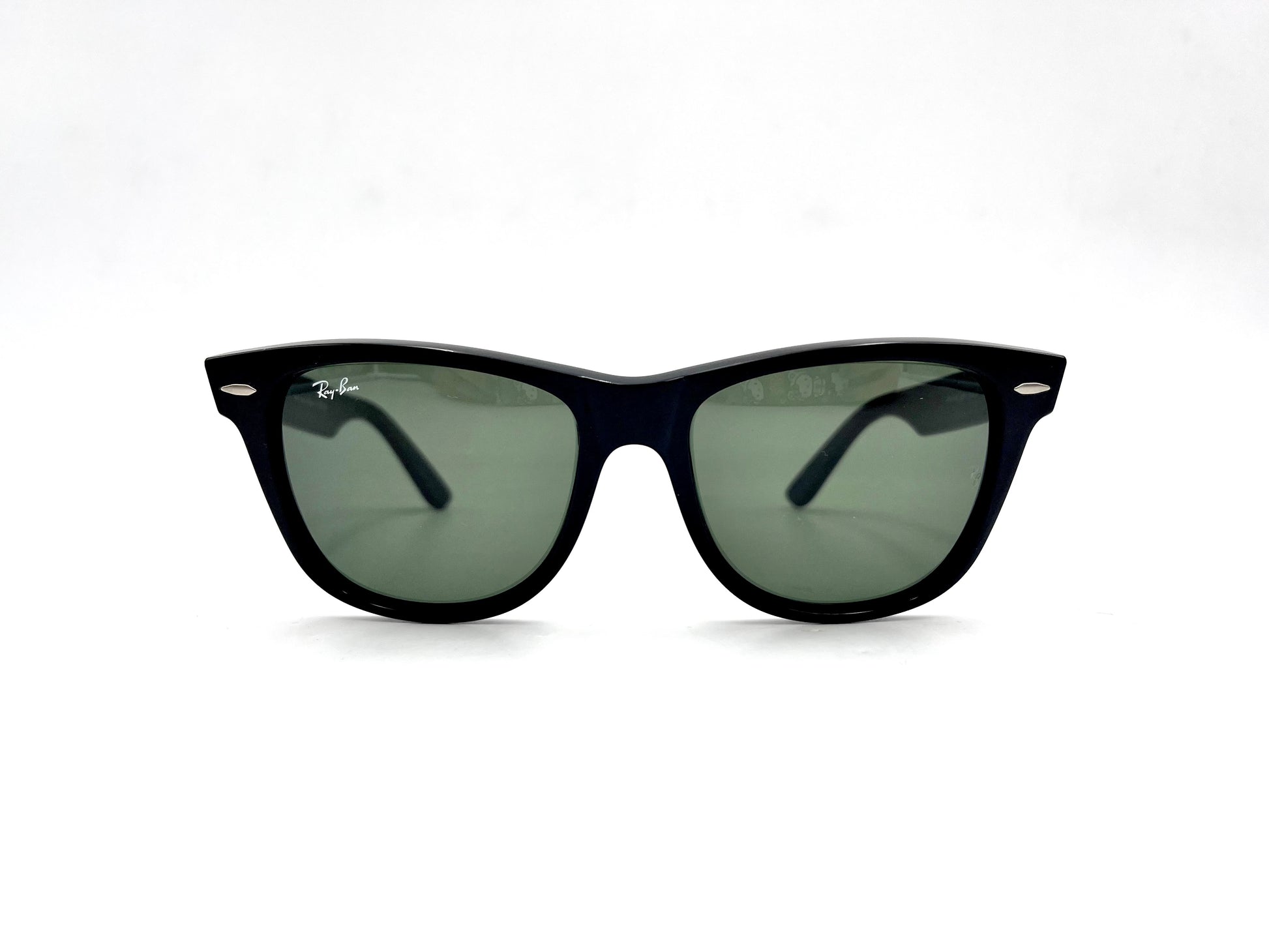 Ray-Ban da sole modello wayfarer in acetato nero opaco, taglia XL. Frontale squadrato con lenti verdi, aste con tipico logo del brand in argento.