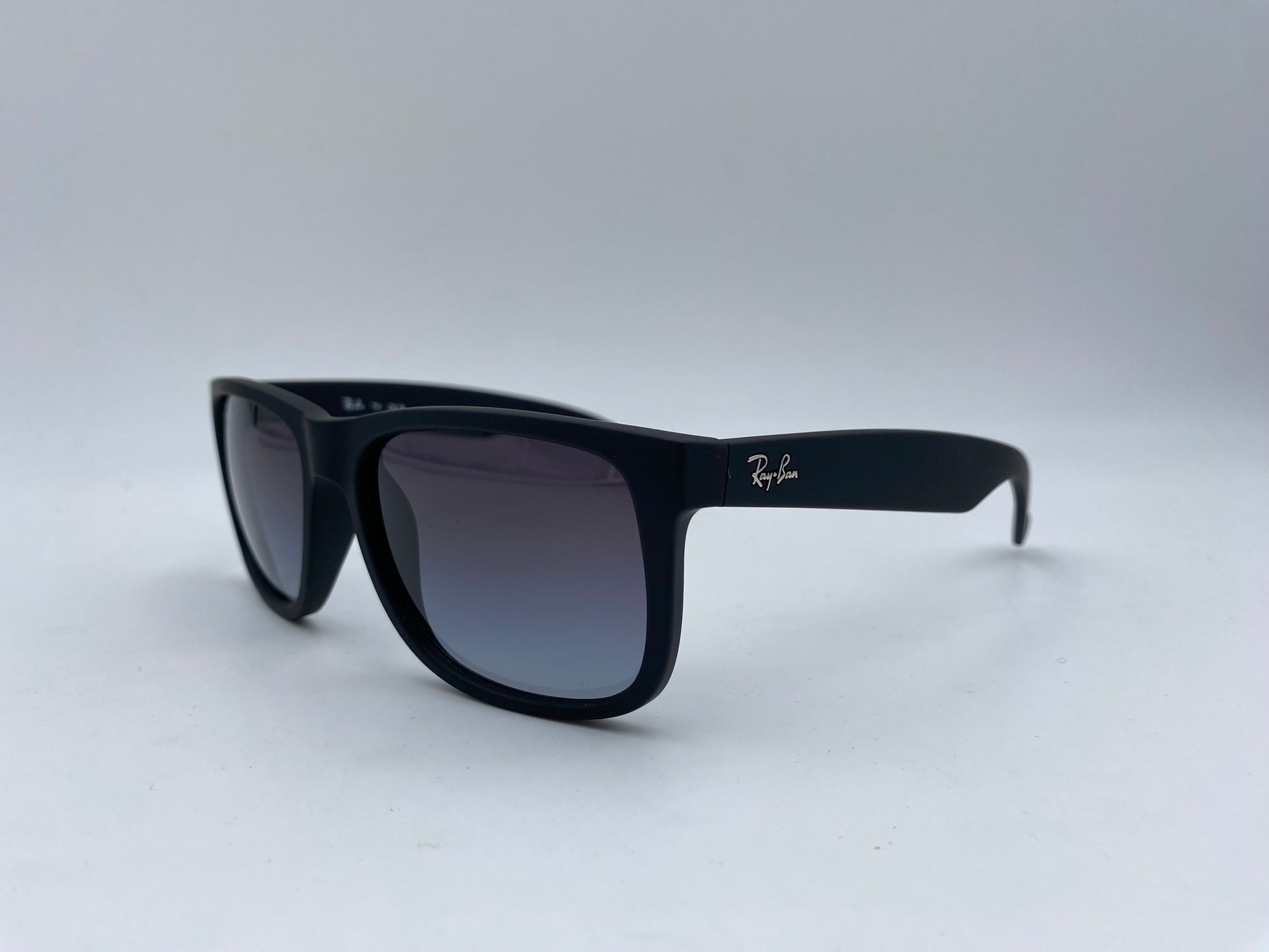 Occhiale in acetato nero opaco firmato Ray Ban. Frontale squadrato con lenti grigie.