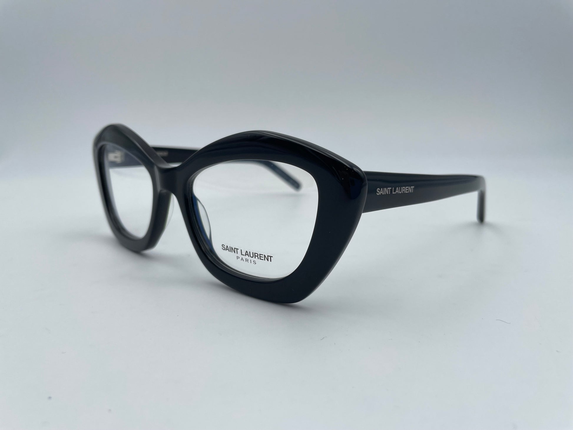 Occhiale da vista firmato Saint Laurent in acetato. Frontale stretto e irregolare color nero con leggero cat-eye. Aste leggere e confortevoli con tipica firma del brand. Comodi naselli acetati.