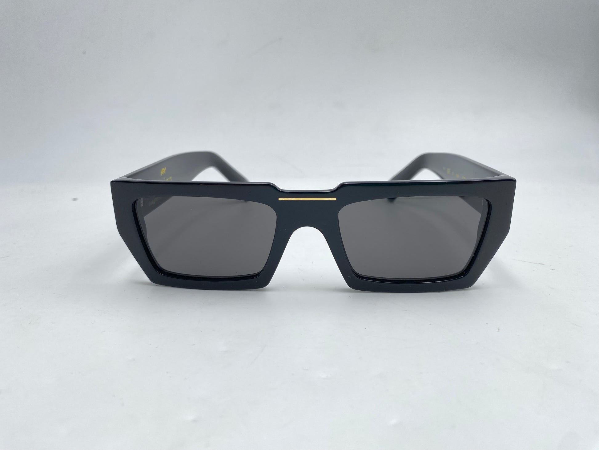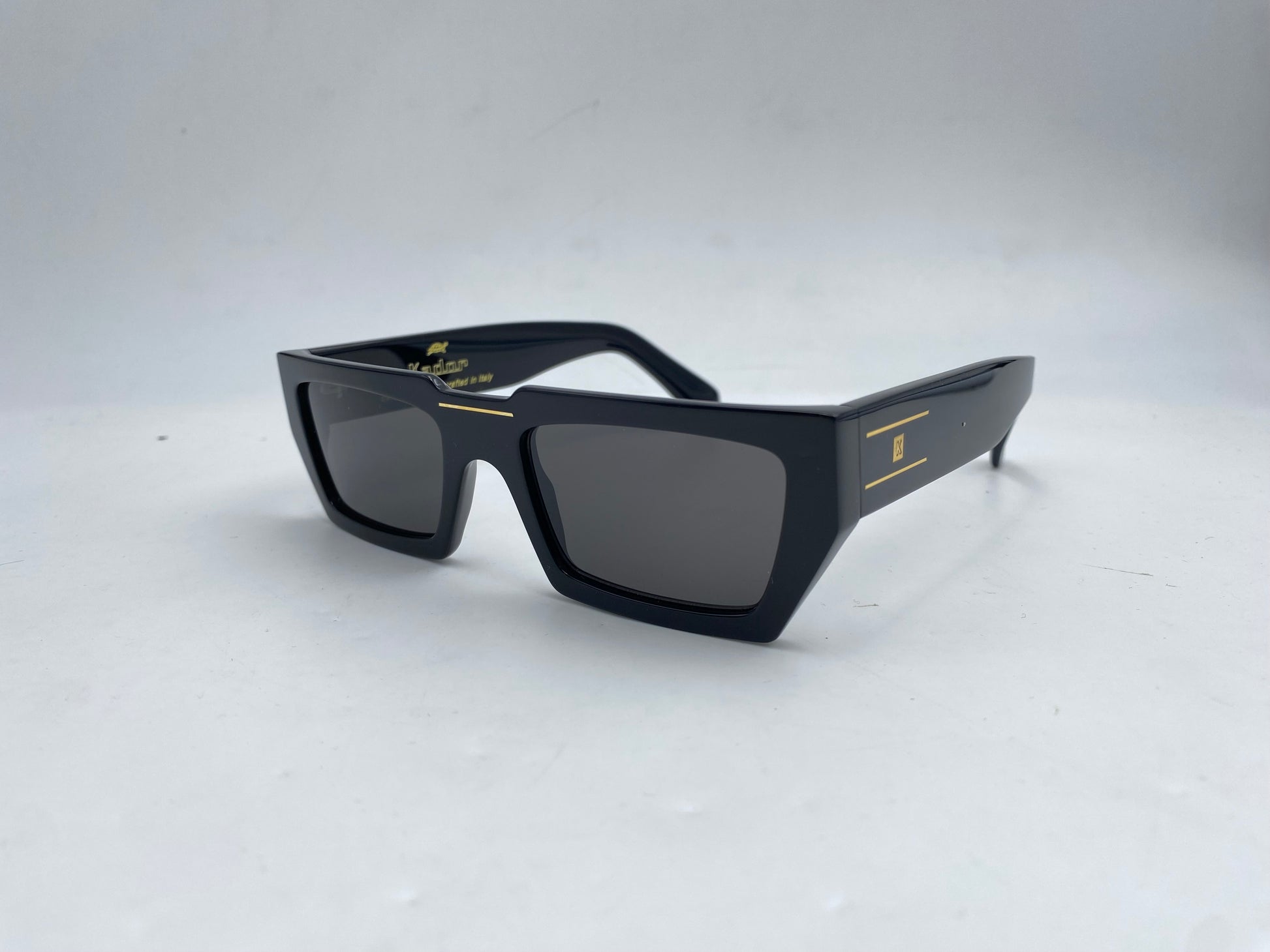 Occhiale da sole Kàdor in acetato nero lucido. Frontale stretto e dritto con lenti scure. Aste ampie e confortevoli con banda oro laterale tipica del brand.