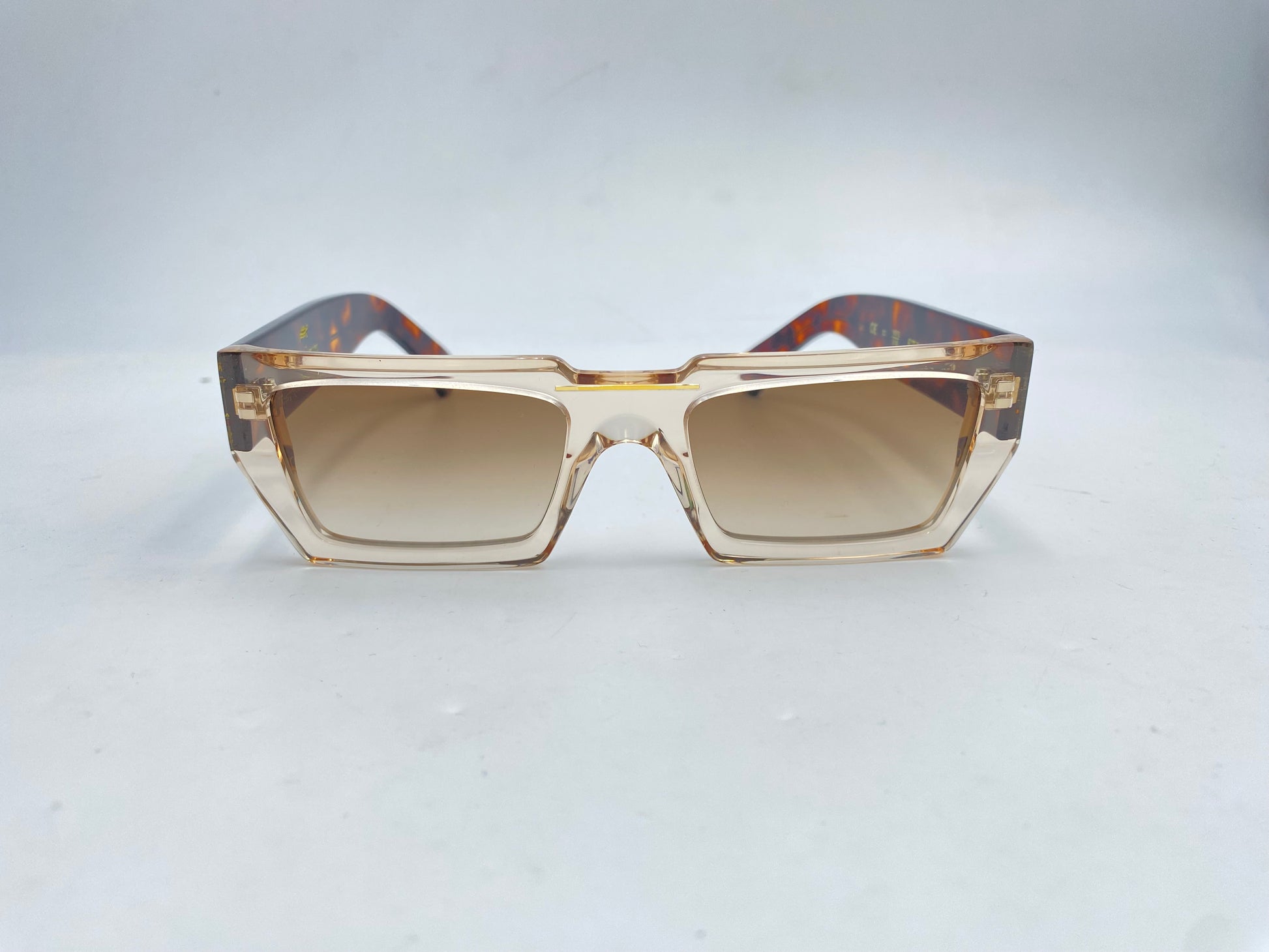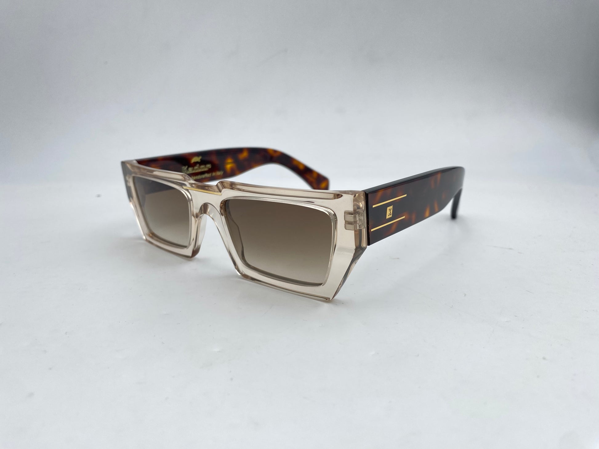 Occhiale da sole Kàdor in acetato trasparente lucido color champagne e aste tartarugate. Lenti marroni sfumate. Aste ampie e confortevoli con banda oro laterale tipica del brand.