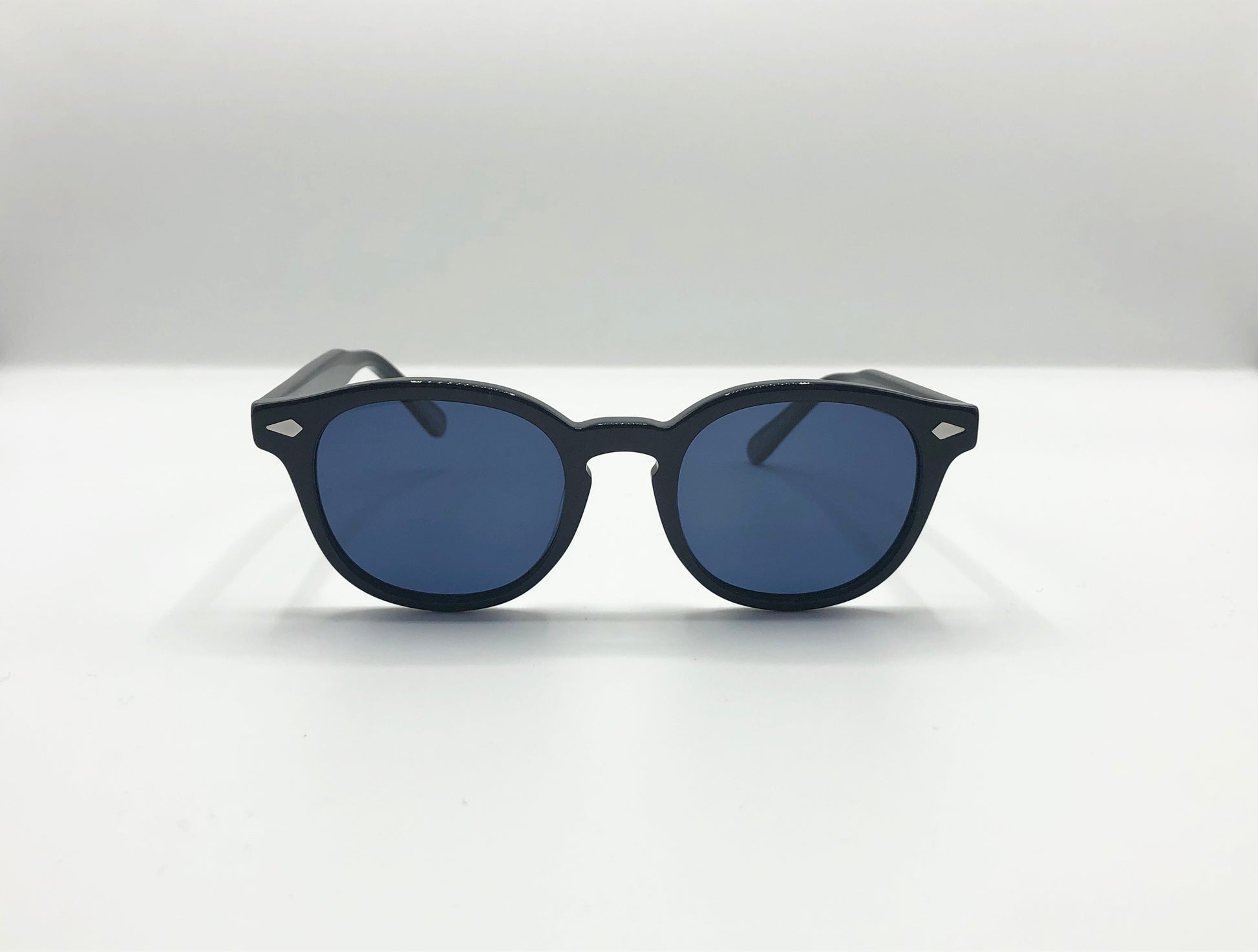 Occhiale da sole in acetato. Frontale stondato nero lucido con dettaglio argento ai lati. Aste irregolari e confortevoli. Lenti polarizzate blu tinta unita. Comodo ponte a chiave, naselli acetati.