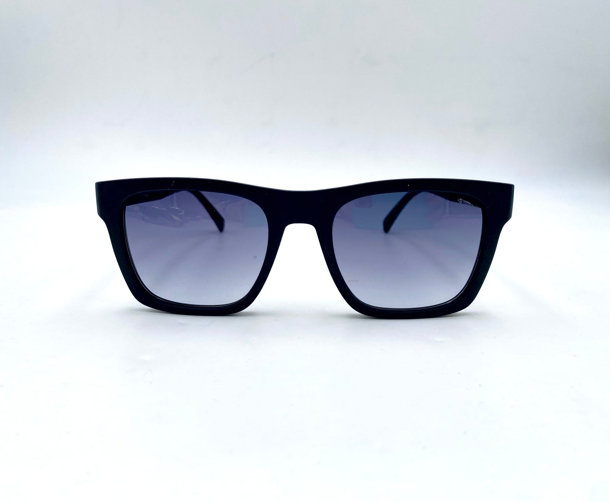 Occhiale da sole Saraghina in acetato nero opaco. Frontale quadrato con lenti grigio sfumato e aste comode e sottili.
