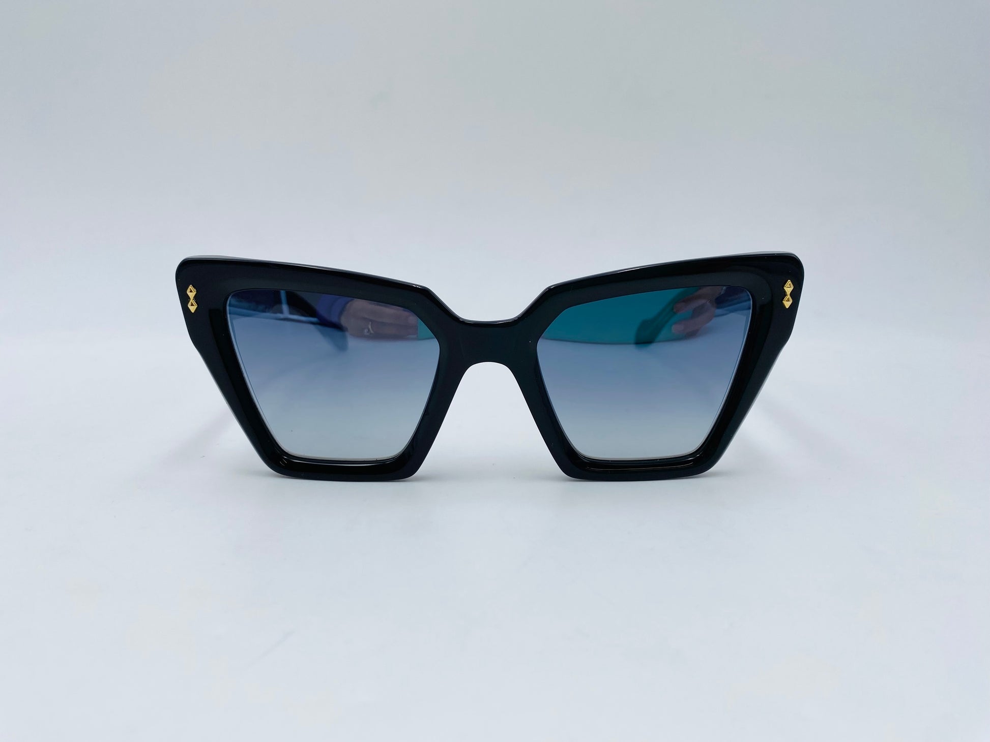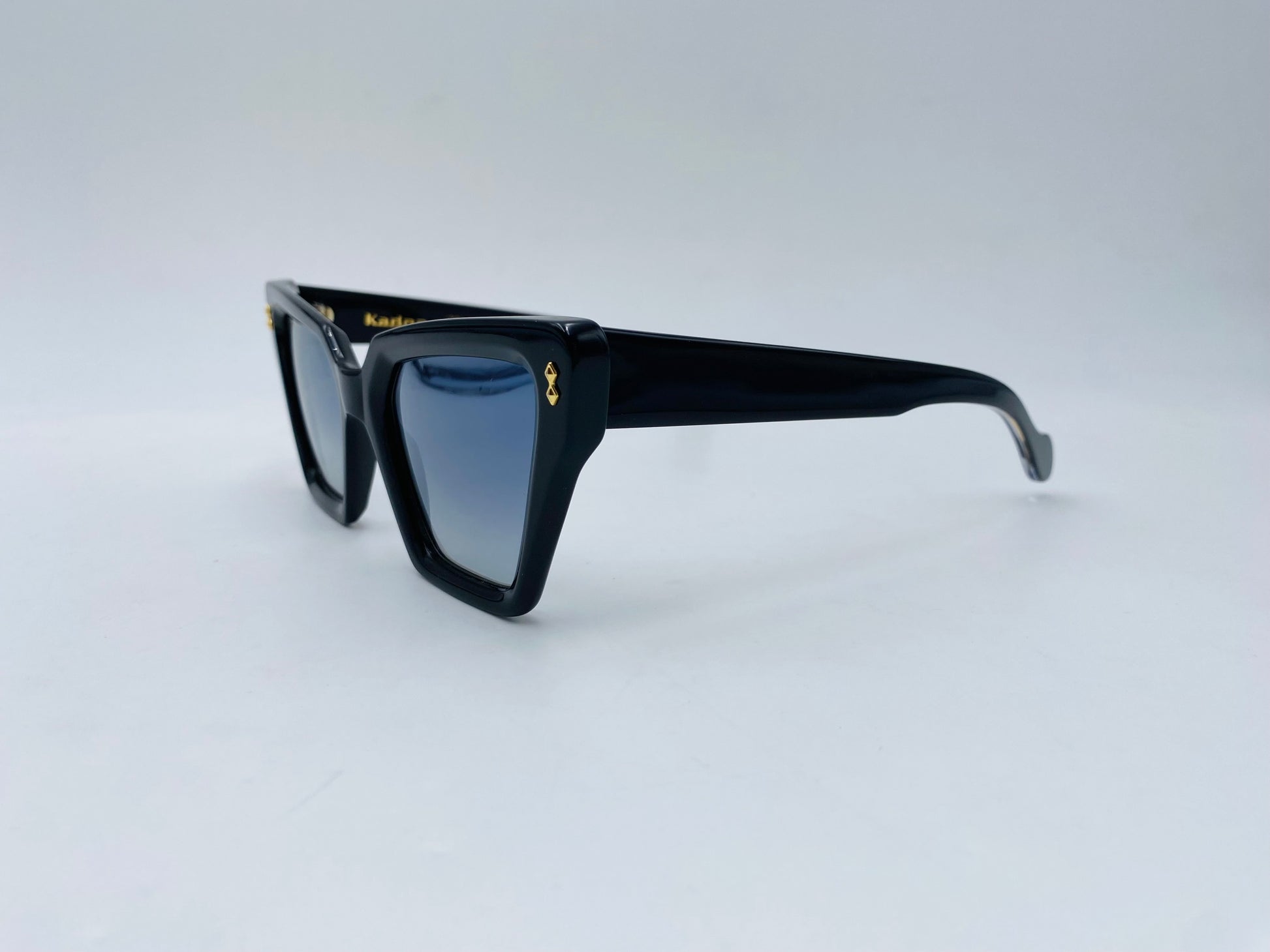 Occhiale da sole in acetato nero lucido firmato Kàdor. Frontale squadrato cat-eye e lenti leggermente specchiate. Comode aste con trama su una delle due a quadri oro tipica del brand.