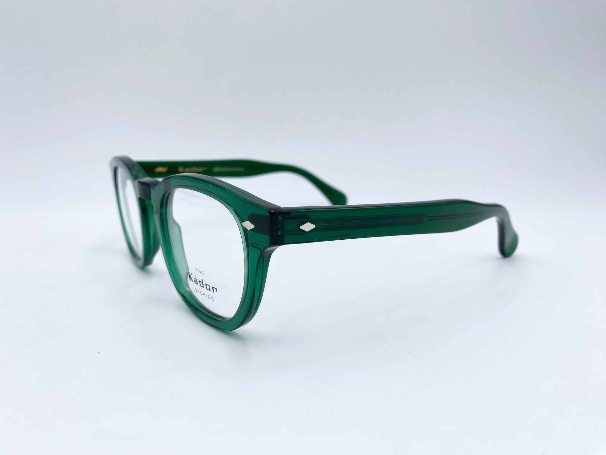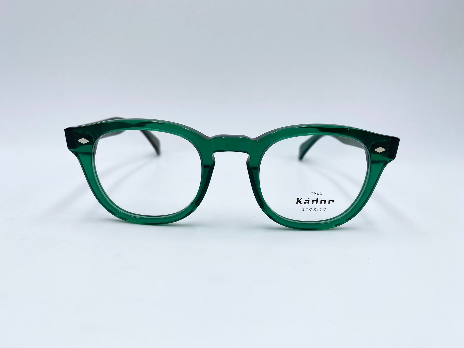 Occhiale da vista in acetato tondo verde smeraldo, con aste confortevoli, ponte a chiave a naselli in acetato.